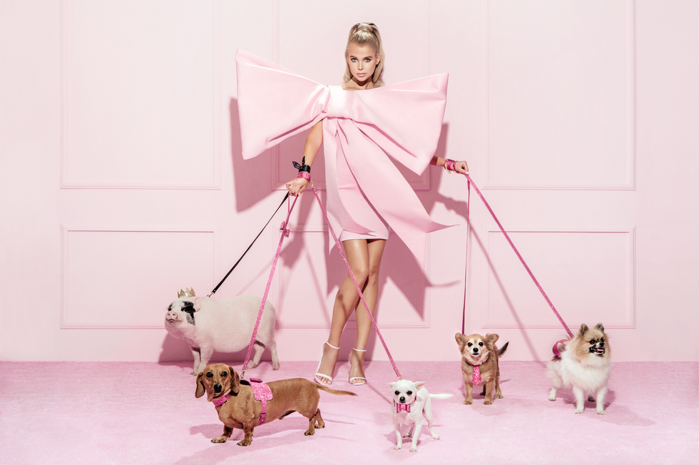 The 14-piece collection, out today, is entirely vegan and cruelty-free, featuring glittered leashes, hot pink harnesses and an instantly iconic "Bitch" leather biker jacket. Cowan designed each piece in reference to his most famous looks, like Gaga's pink glitter tux and Paris Hilton's oversized bow dress.