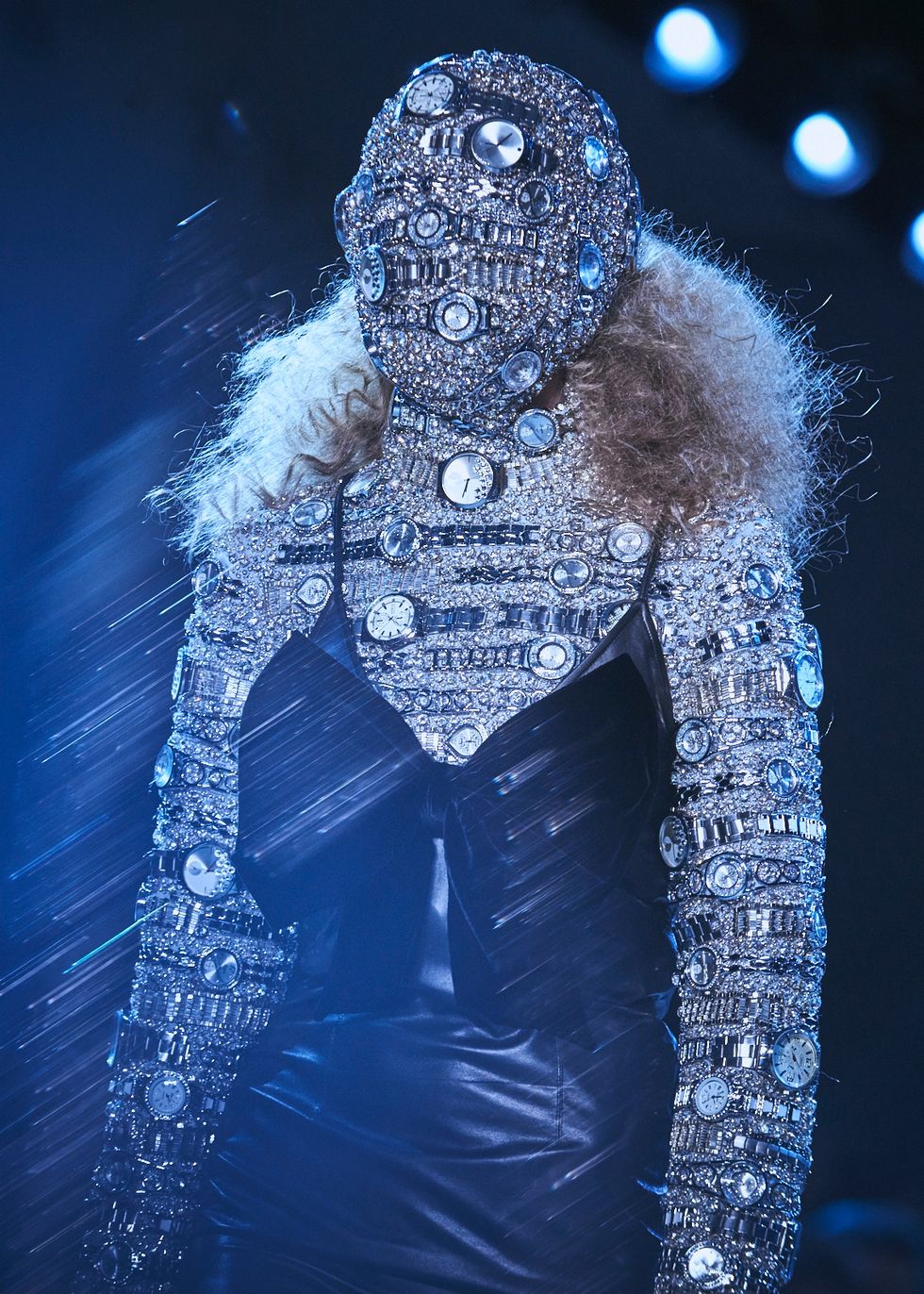 In past season, some of Cowan's most Instagrammable looks have been stacked, bling-y watches one on top of the other. He took this motif to new height by showing the watches in a new form, which covered an entire model's face and arms, as well as in smaller aspects, on the arm of a dress.