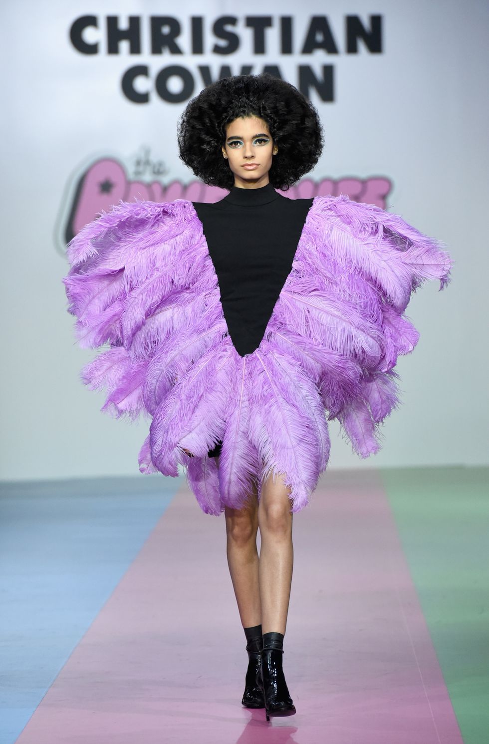 Cowan may have just shown his fall 2019 at NYFW last month, but this collection presented an entirely new range of clothing and accessories. Models walked down the Powerpuff Girl rainbow-hued runway to tunes by strong female lead singers while a selection of gowns with handiwork that verged on demi-couture was presented. There was one extremely structural black dress with an uplifted tutu constructed of feathers that resembled a couture silhouette of the early 1950s: Cowan's personal favorite of the collection.