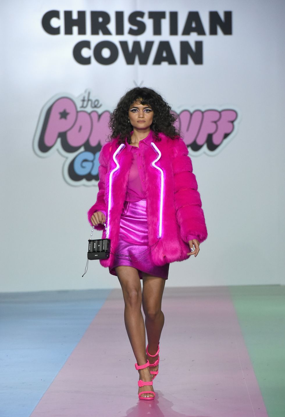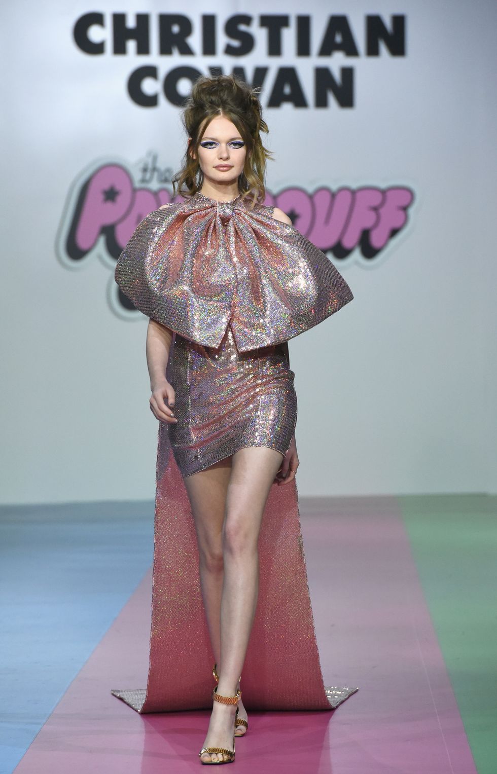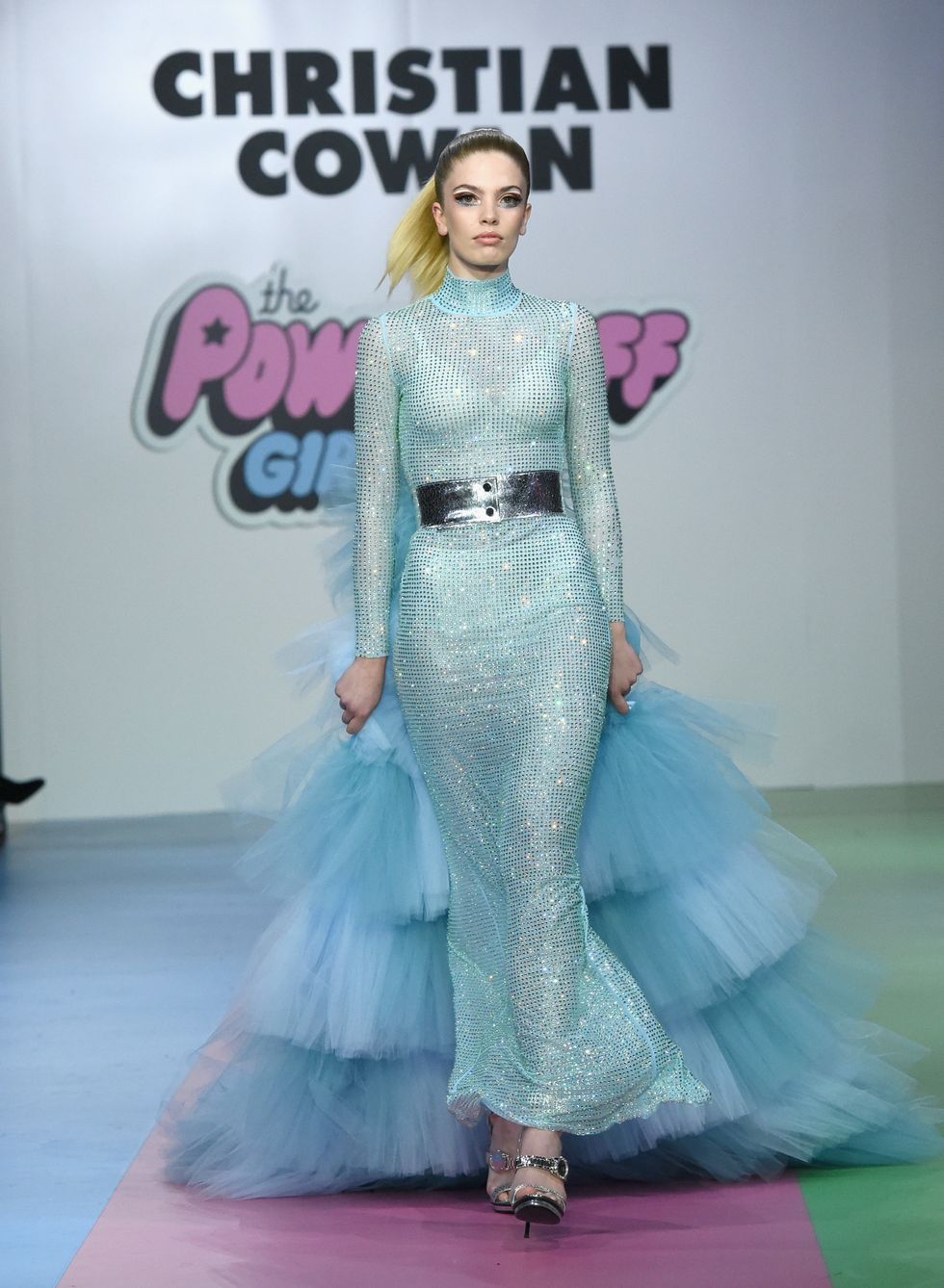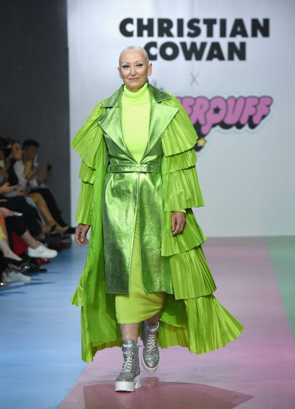 The show opened with a trio of models walking down the runway wearing high impact glitter suits in shades that corresponded with the colors of the original Powerpuff Girls: blue for Bubbles, pink for Blossom and green for Buttercup. Glittering mini dresses with supersized bows, clear raincoats with matching oversized hats, dresses with hundreds of Preciosa crystals (no Kira Kira needed!), lilac and neon green feathers and pleated tulle dresses and trains (a continuation of what we saw at Cowan's fall 2019 show in New York) were all there and more.