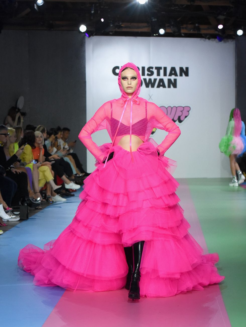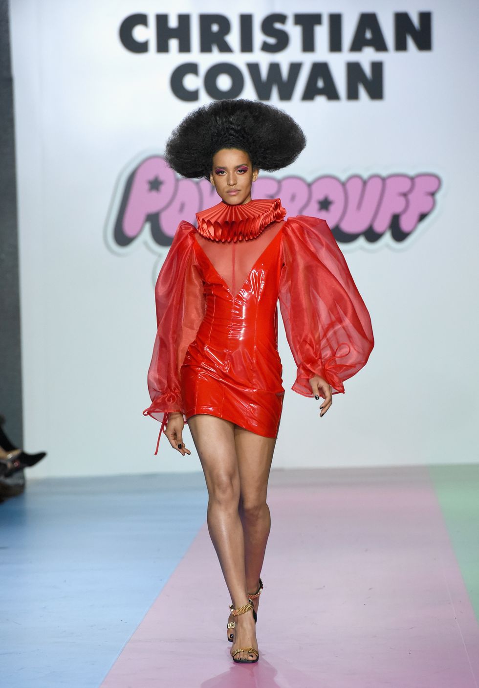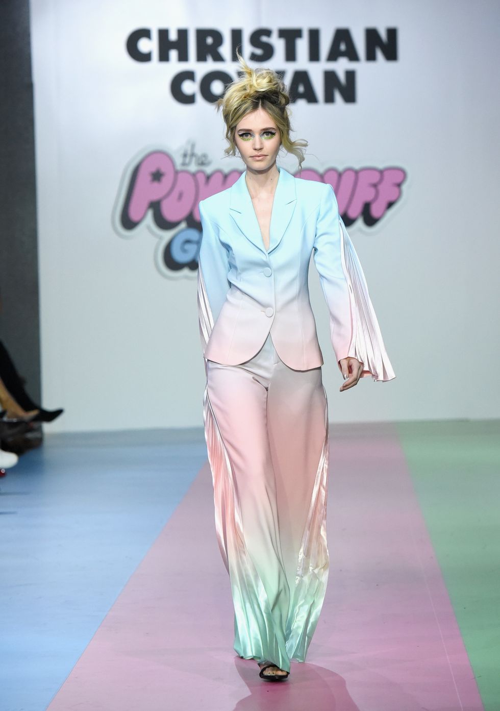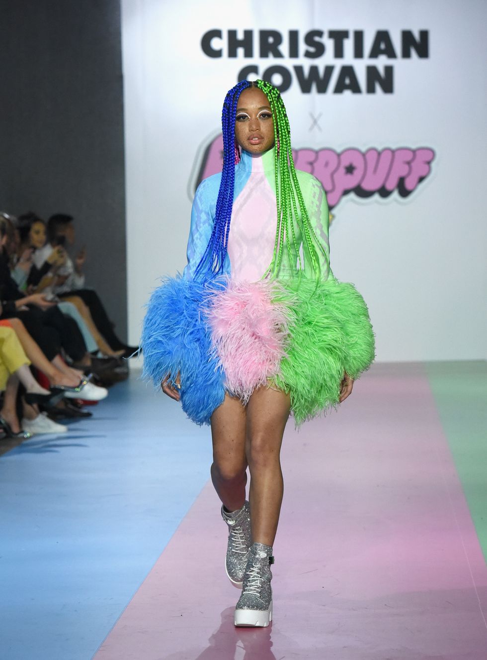 The show opened with a trio of models walking down the runway wearing high impact glitter suits in shades that corresponded with the colors of the original Powerpuff Girls: blue for Bubbles, pink for Blossom and green for Buttercup. Glittering mini dresses with supersized bows, clear raincoats with matching oversized hats, dresses with hundreds of Preciosa crystals (no Kira Kira needed!), lilac and neon green feathers and pleated tulle dresses and trains (a continuation of what we saw at Cowan's fall 2019 show in New York) were all there and more.