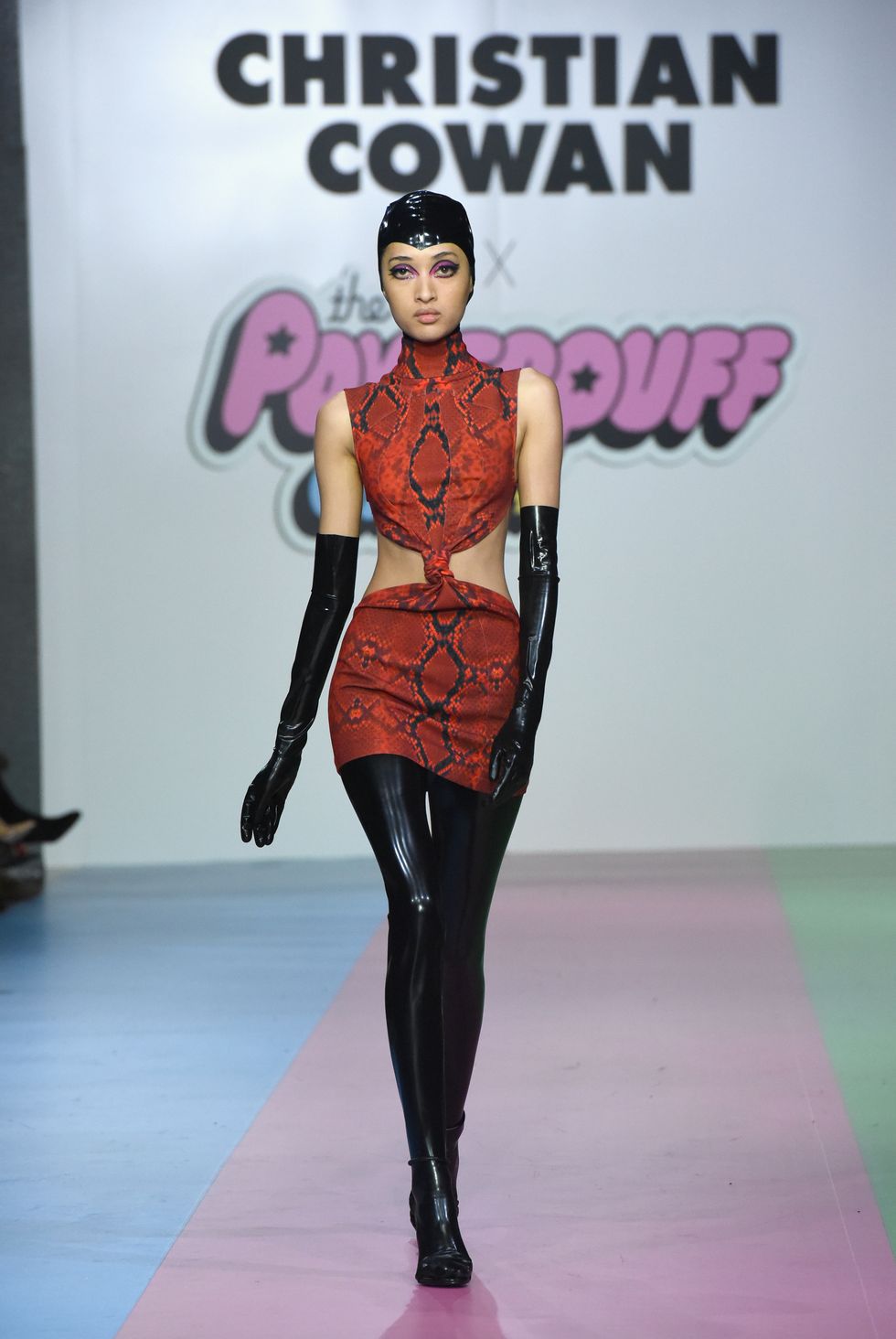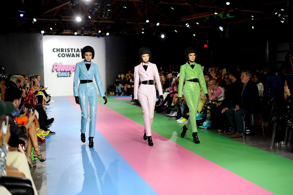 "It's inspired by Powerpuff Girls but in many different ways. We have some literal translations of the girls that you'll see and we have some about new characters they're introducing, but also the vibe," explained Cowan. "I watched many cartoons growing up." The casting in the collection was diverse too, and featured one older woman as well as Khrystyana Kazakova, who wore a glittering sequin hoodie dress, from Season 24 of America's Next Top Model.