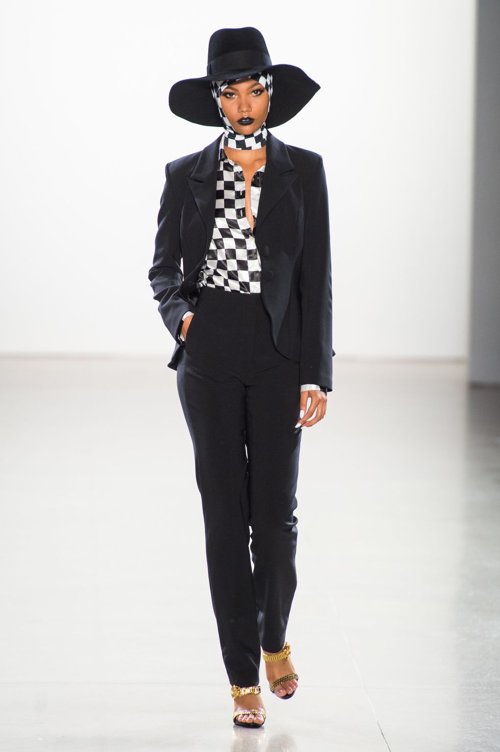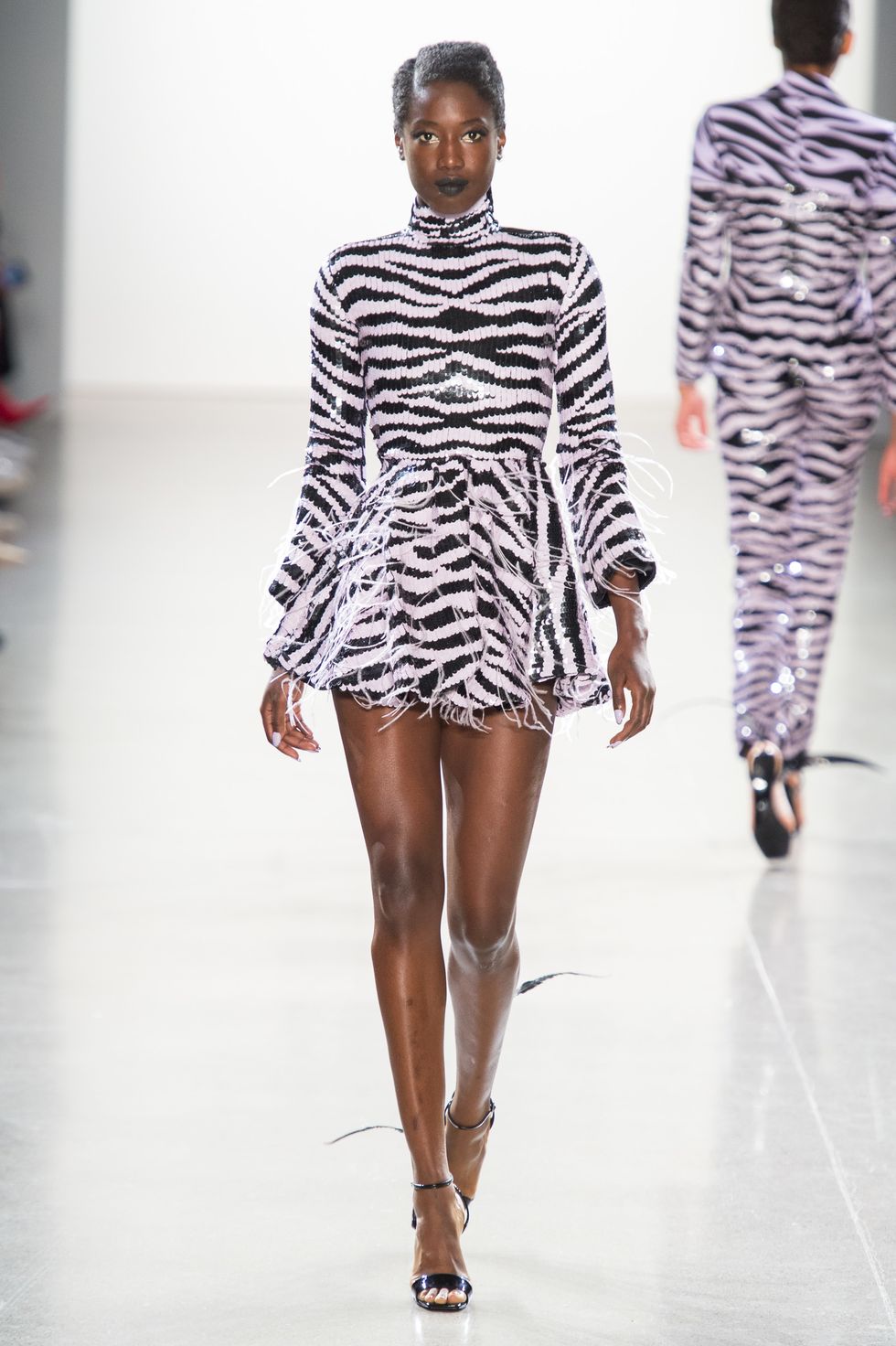 Cowan utilized his trademark checkerboard pattern, which Cardi B wore on the cover of her hit album Invasion of Privacy, on several pieces. The designer played with the style, showing sheer sequined versions.