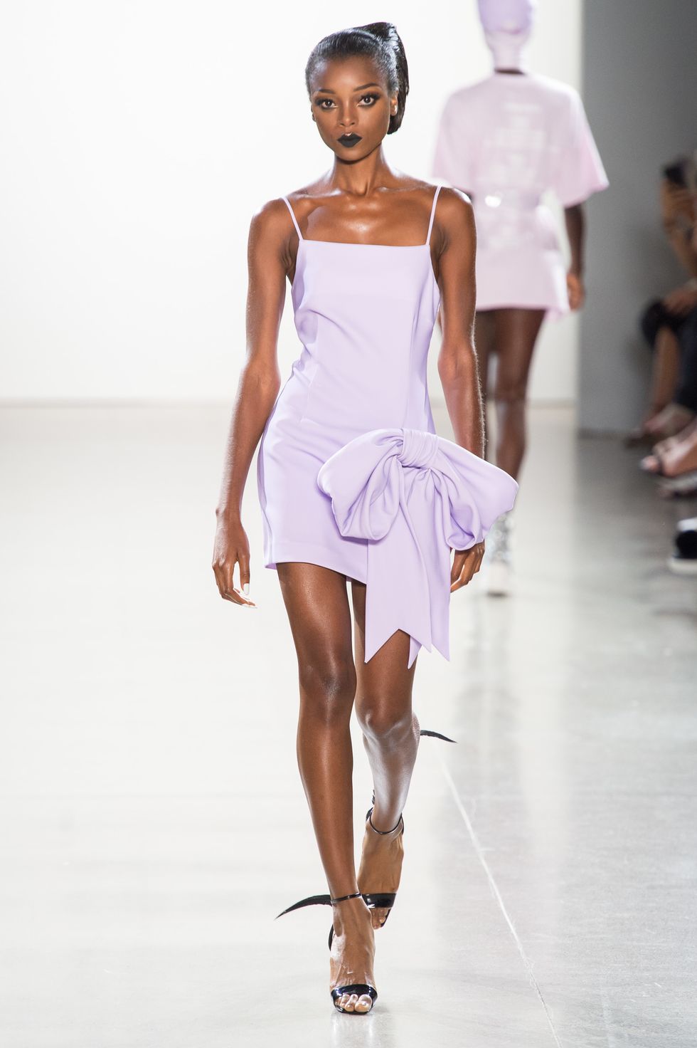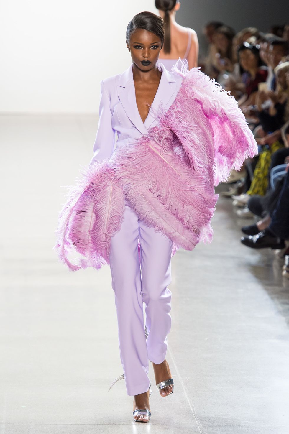 While much of Cowan's color palette consisted of black and strong primary and neon colors, he finished out the show with slip dresses and suits in delicate lilac, and a t-shirt dress with a hat by Eugenia Kim. The final look, a lavender suit with an asymmetrical trim of enormous purple feathers, was a stunner.