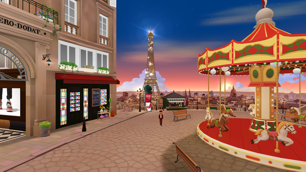 From a terrace overlooking a digitized view of the city to the Galerie Véro-Dodat where he opened his first store in 1991, the home-hitting experience gives users a look at the visionary's long-standing legacy in France. At its center, the space featured a paved round square, complete with a traditional Parisian bistro, a creperie, a carousel, Morris columns and a virtual replica of the rue Saint-Honoré flagship and a Loubi Disco.