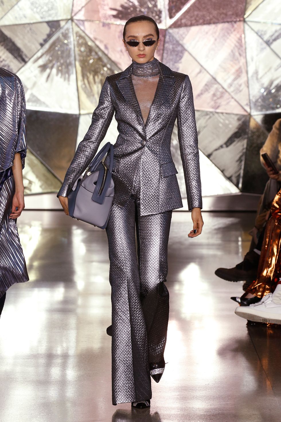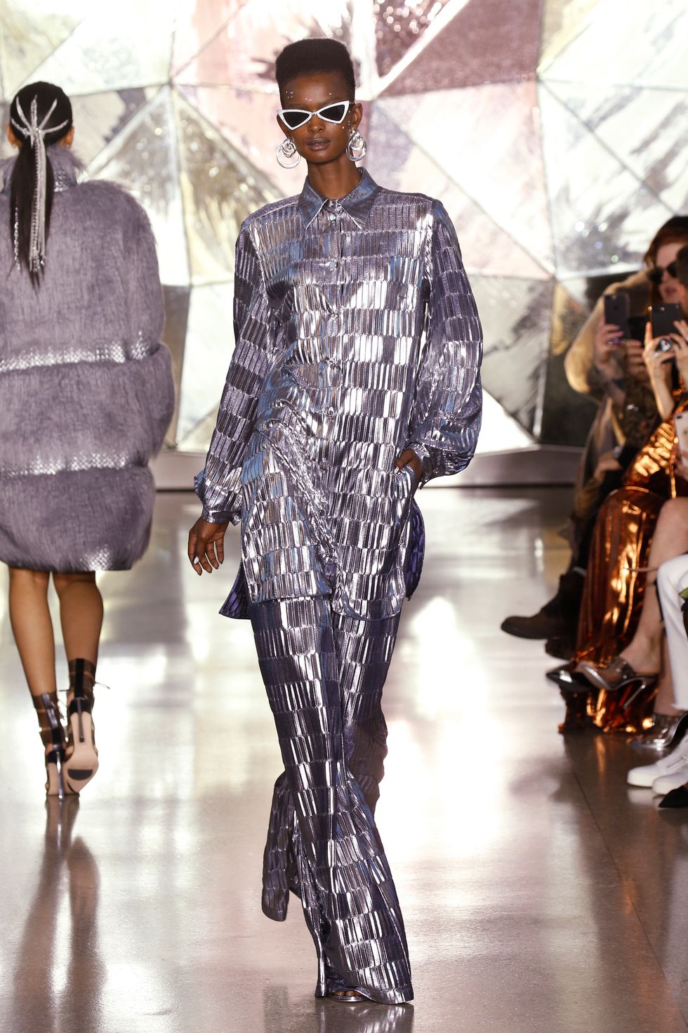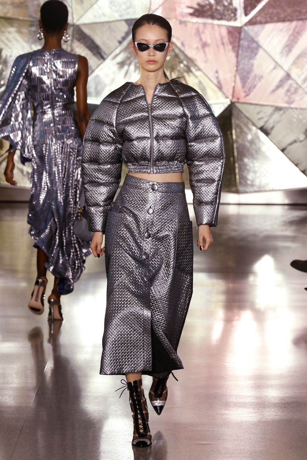 Focusing on the color silver, Siriano sent the first couple of models down the runway wearing silver dresses in different textures with mirror-like finishes. Other pieces, including a luxe puffer-like suit, came in less shiny but still gilded fabrics.