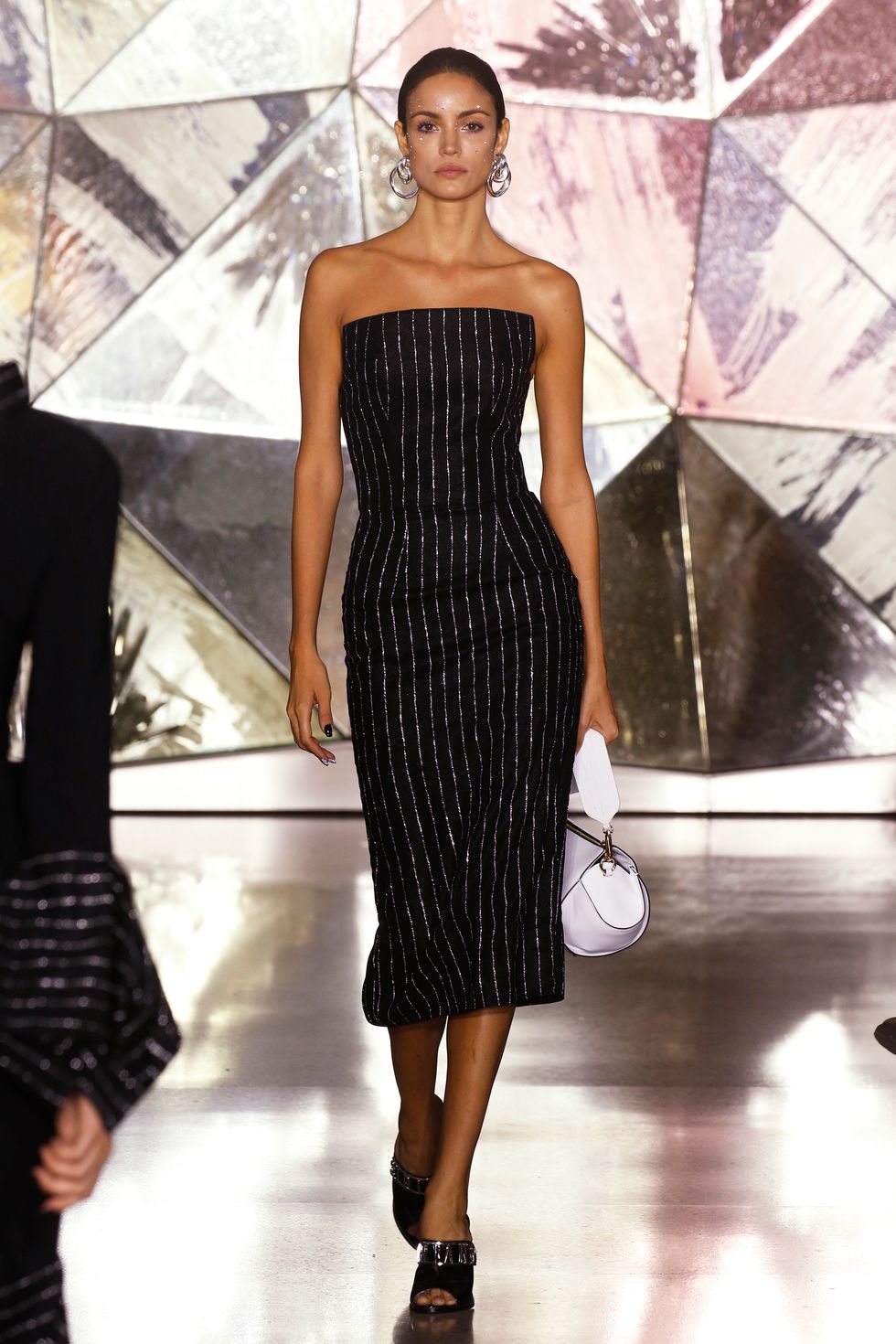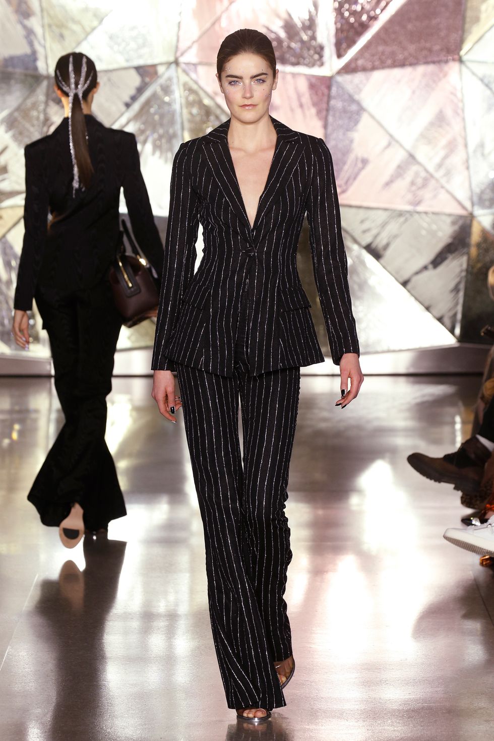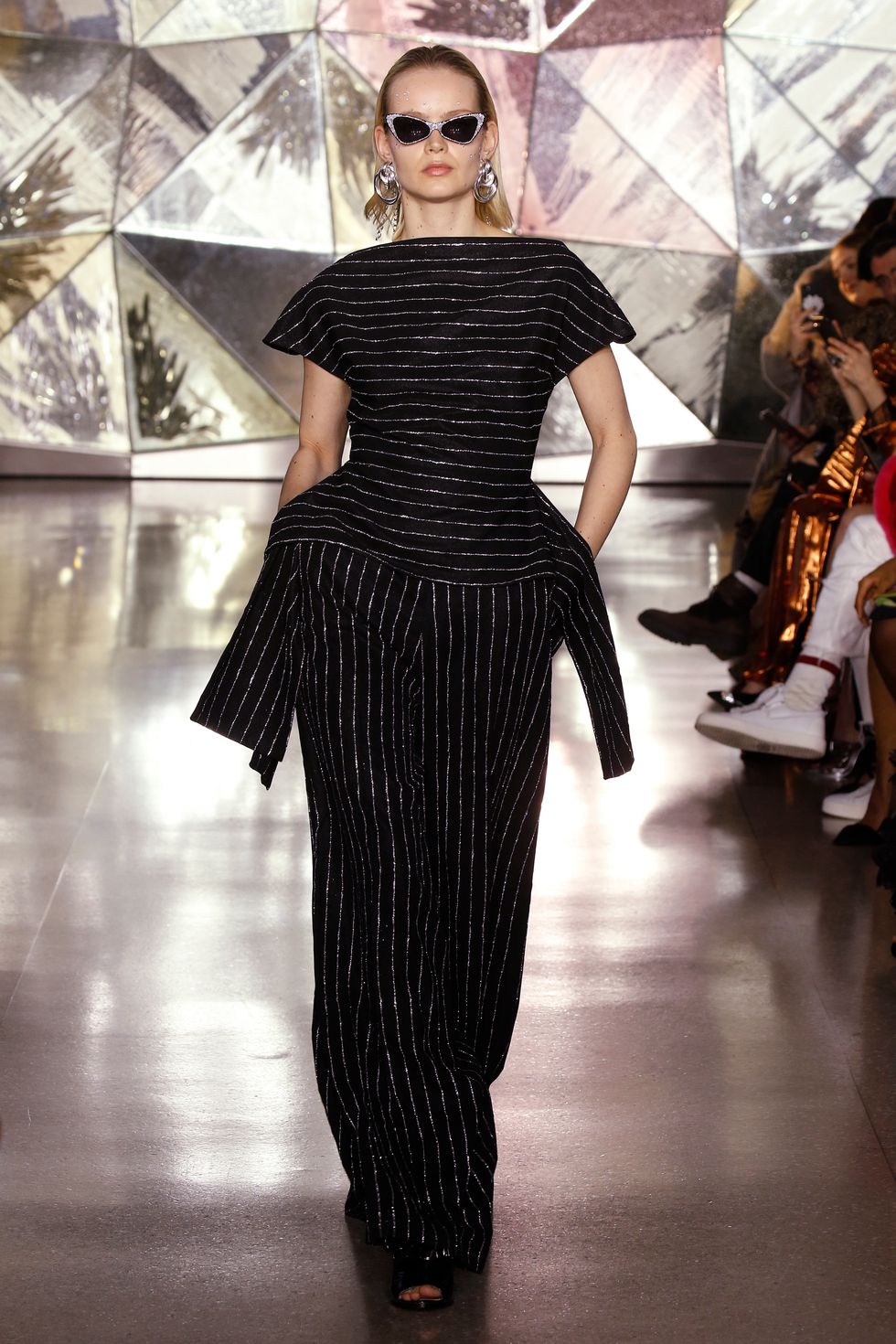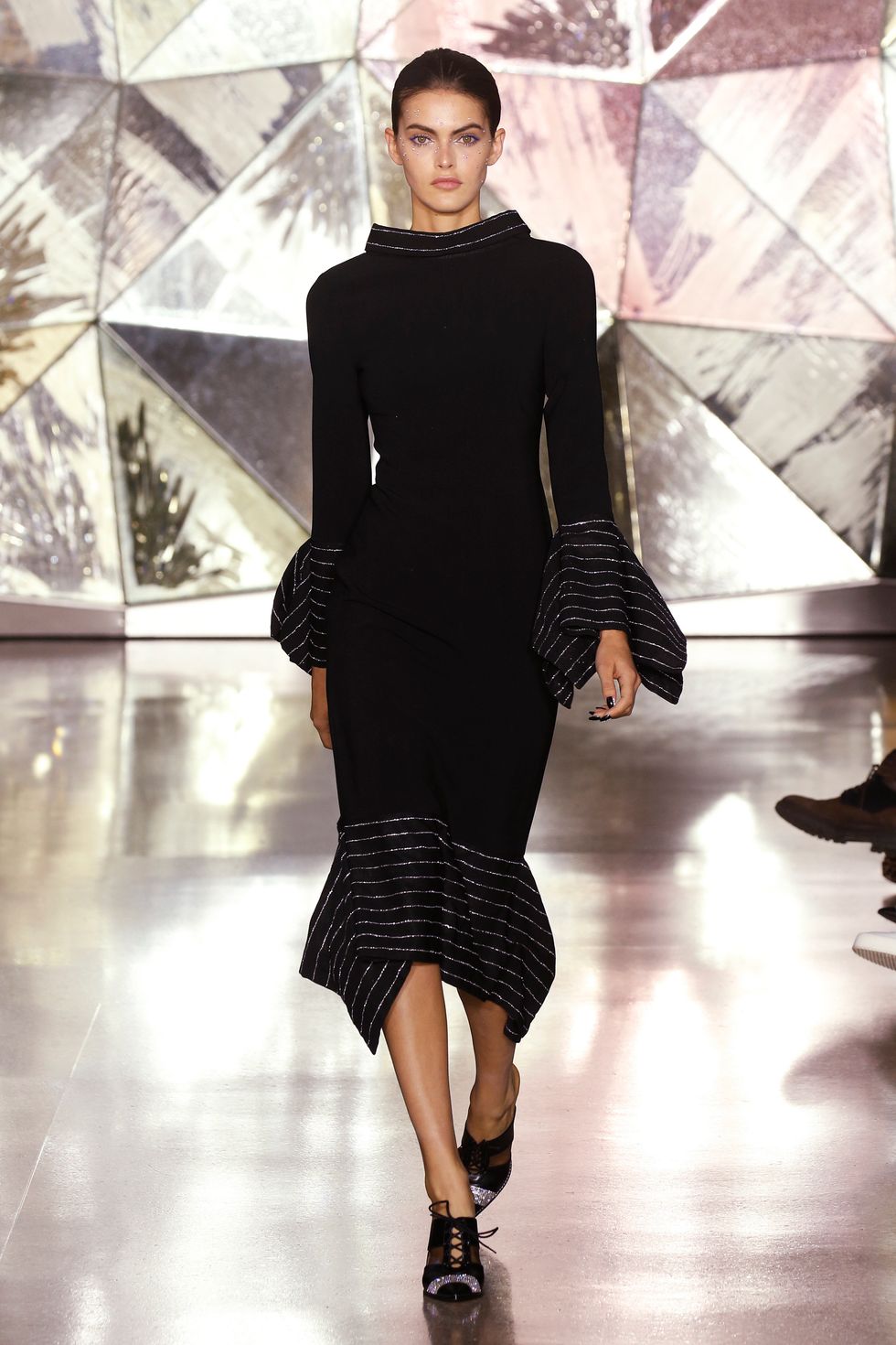 Stripes were the sole print within the collection. Whether used as a sort of (silver lining) accent on black fabrics or printed vertically and horizontally on metallic dresses and jumpsuits, they covered a good number of looks throughout Siriano's fall 2019 collection.