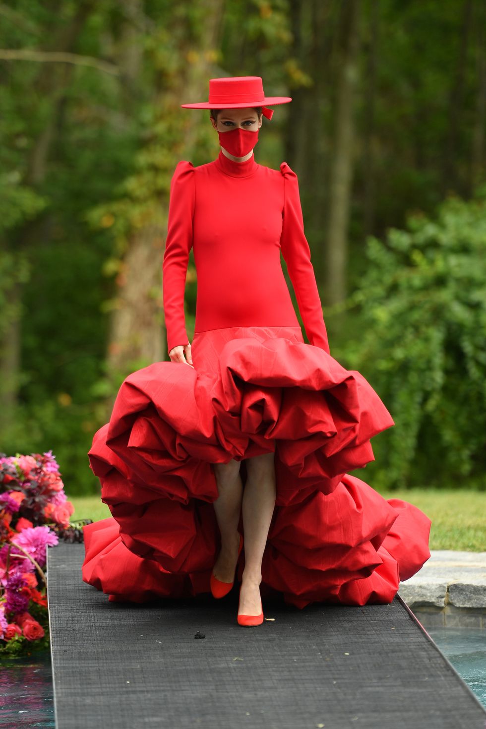The clothes were trademark Siriano: a mix of pomp, glamour and hourglass silhouettes, where models strode across a makeshift bridge over the pool and around the grassy enclave. Virtually every look was paired with a matching couture-like mask, not surprising considering he was one of the first designers in New York to produce face masks at the height of the pandemic.