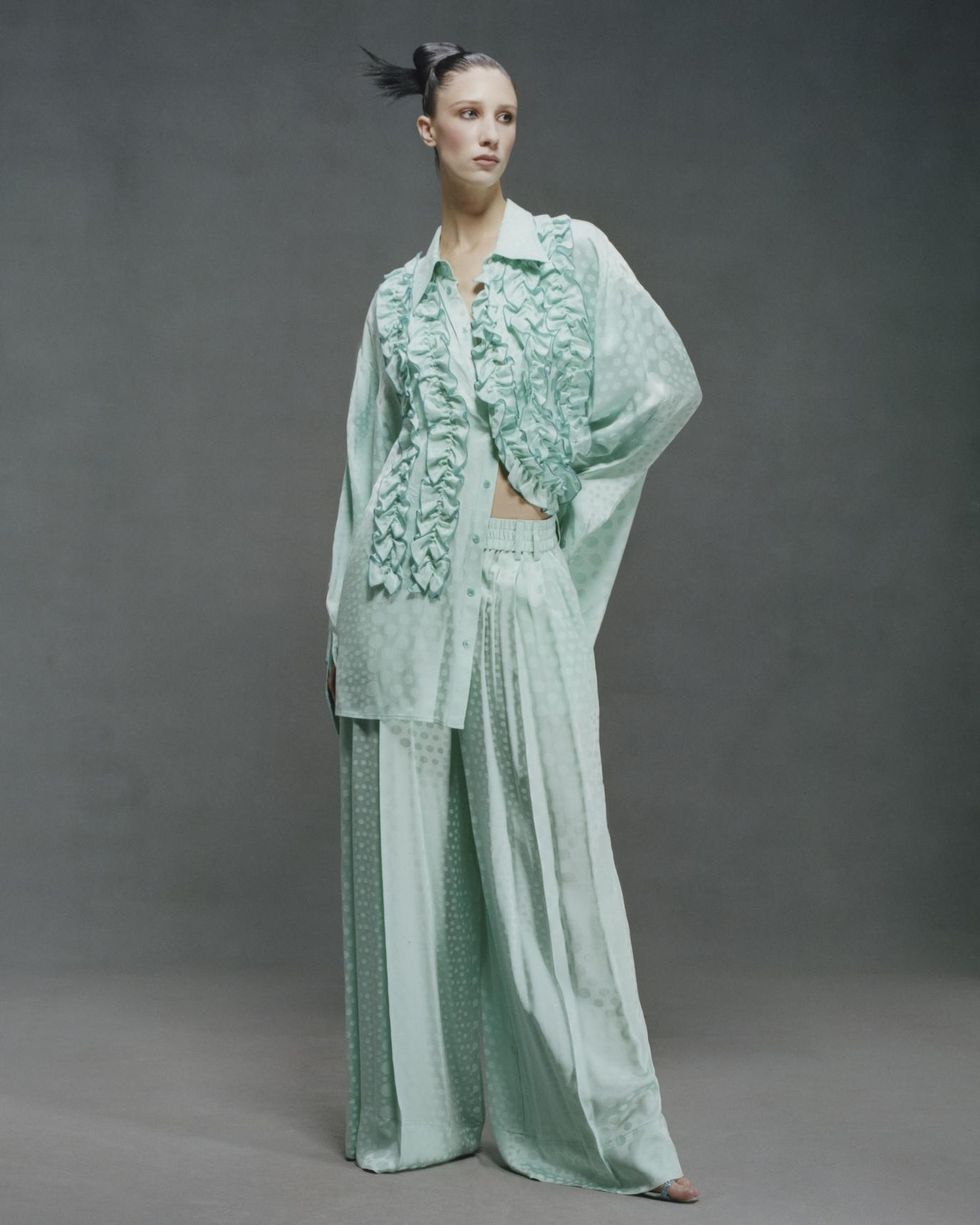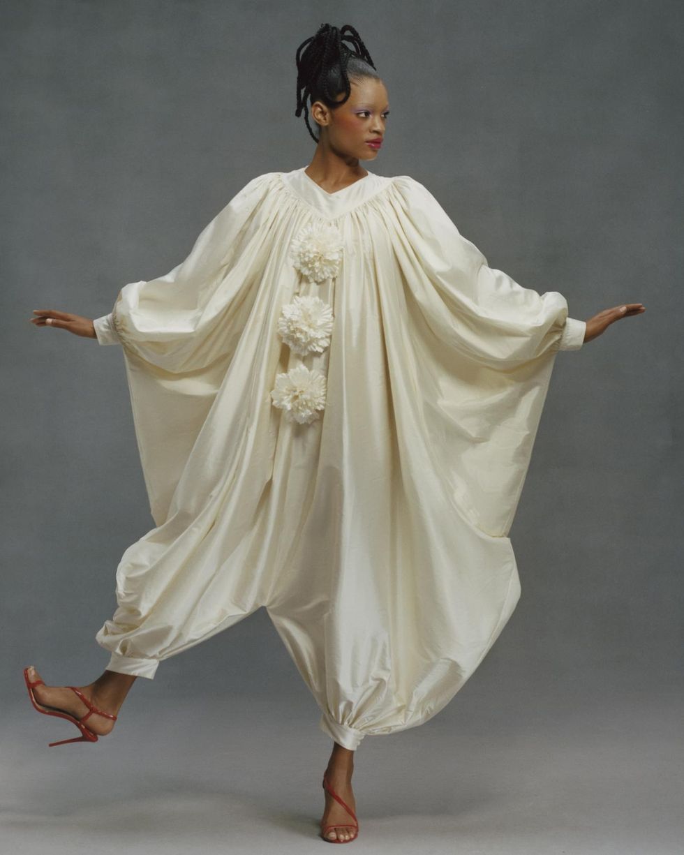 Indeed, he once described Collection 5 as being about "clowns on vacation" where he looked at characters that make you laugh like Italian and French Pierrots. The last look of that show, a white Pierrot collared gown covered in crystal dots, made a return of sorts for the one he launched today in Look #6: a silk balloon jumpsuit with flowers embroidered where pompoms would be.
