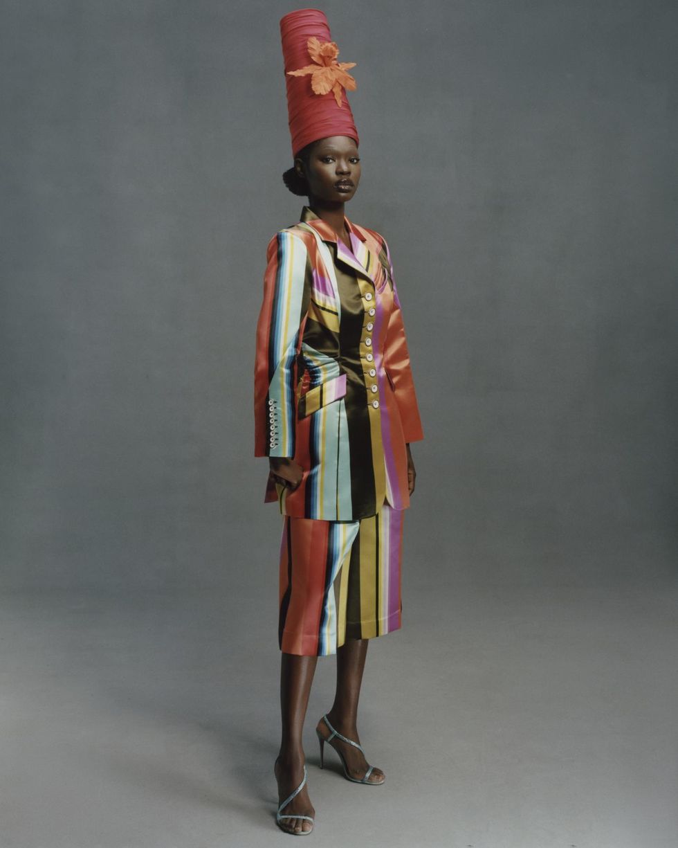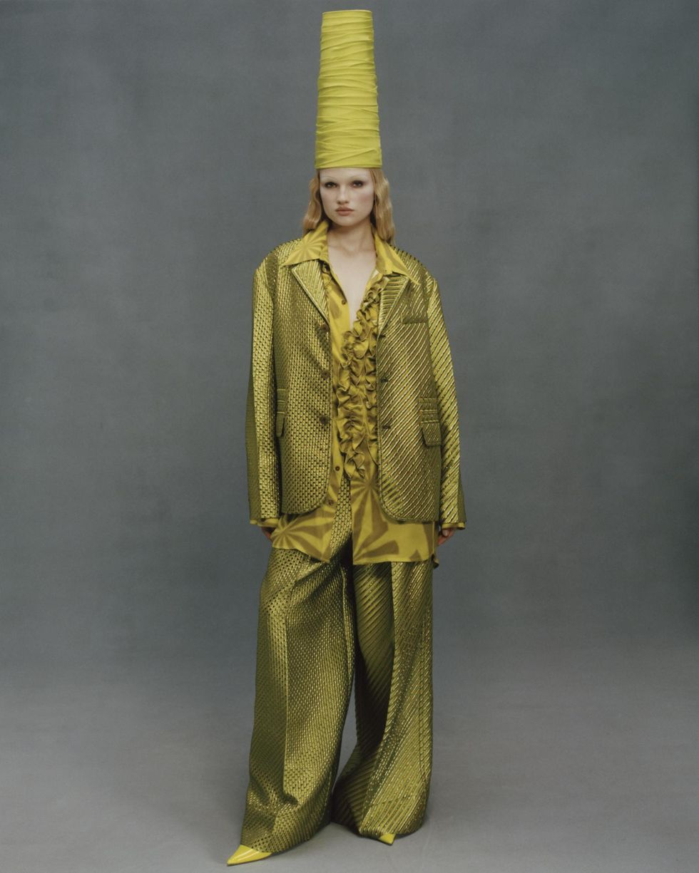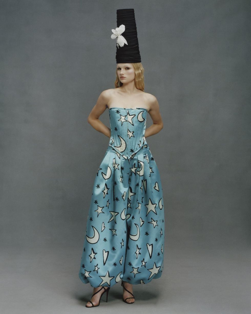 He leaned into that even more so for Collection 11, not just with literal touches like red clown noses, Harlequin prints, balloons and towering party hats but with the playful, exuberant and whimsical energy his brand is known for (see the rainbow hole punches, jumpsuits that look like bulbous dresses and his signature colorplay on stripes).