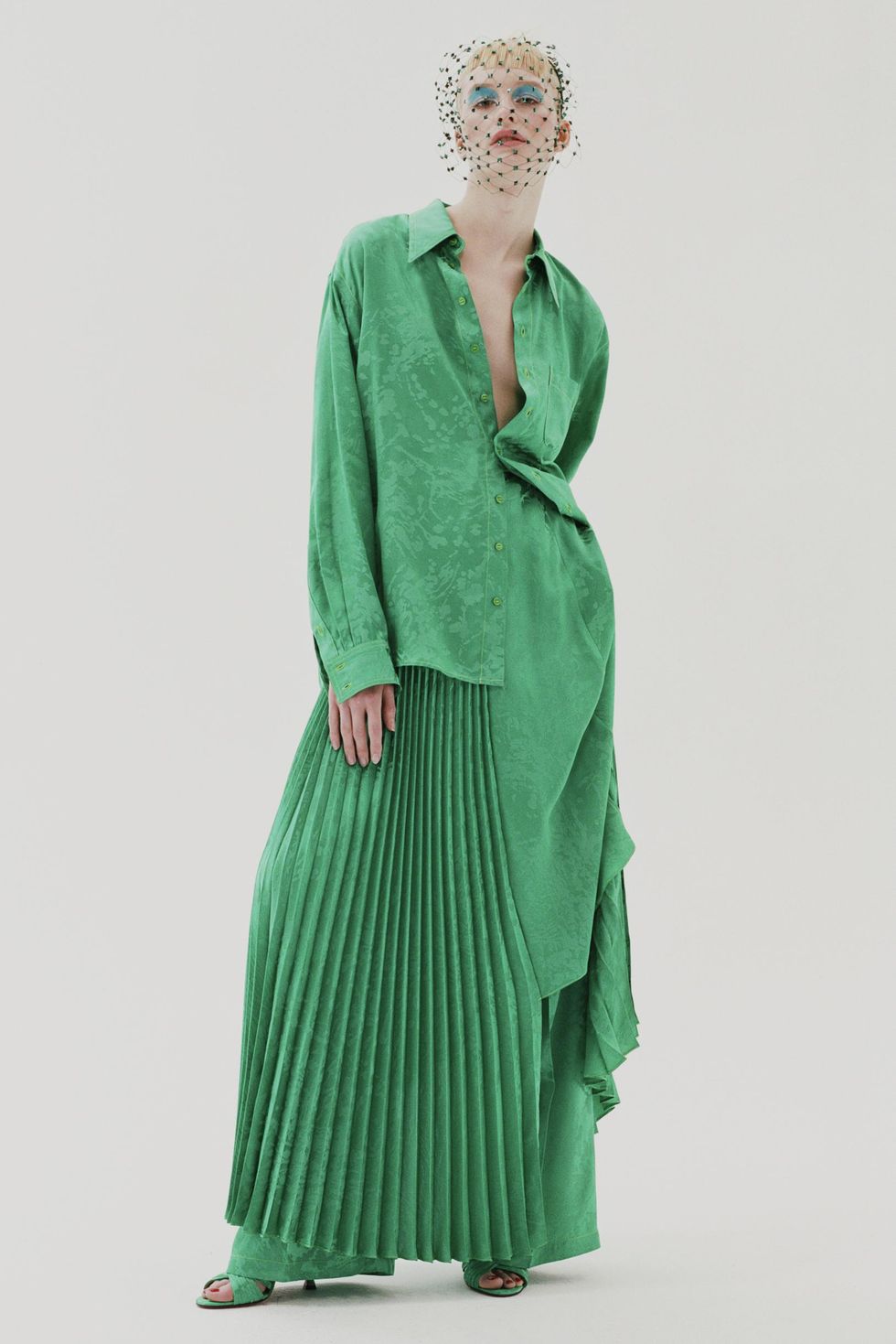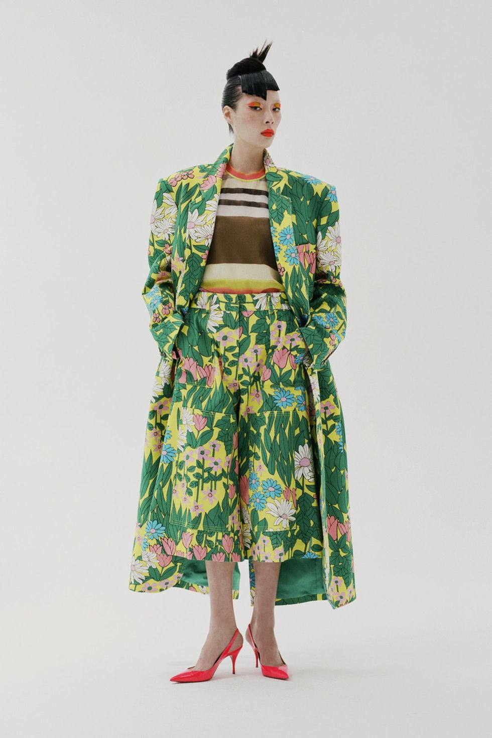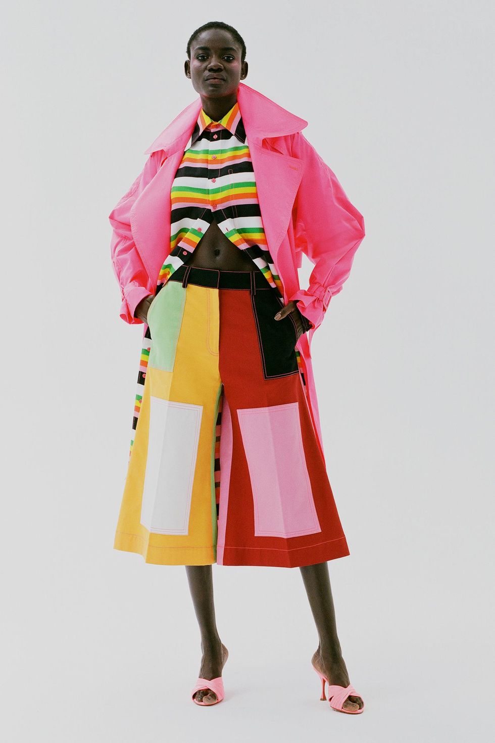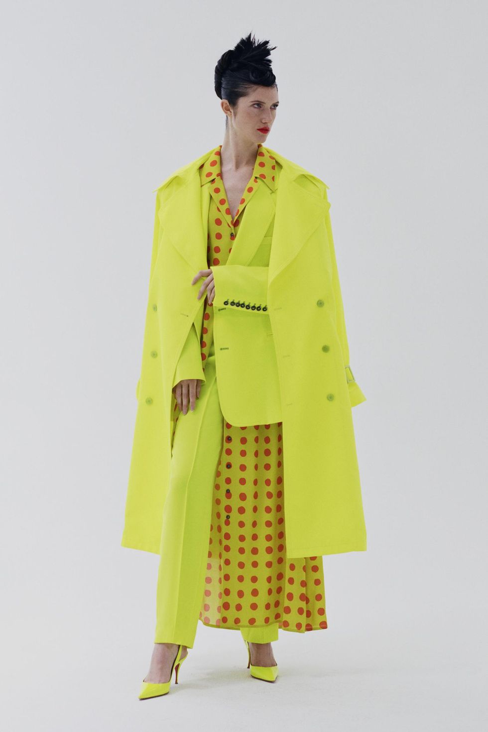 Neon hues of lemon yellow, electric pink and varying greens ranging from chartreuse to emerald are present throughout the entire collection. Hand-drawn polka dots across wardrobe staples, marker scribbles on trench coats and louder-than-life prints appear throughout the 40 looks.