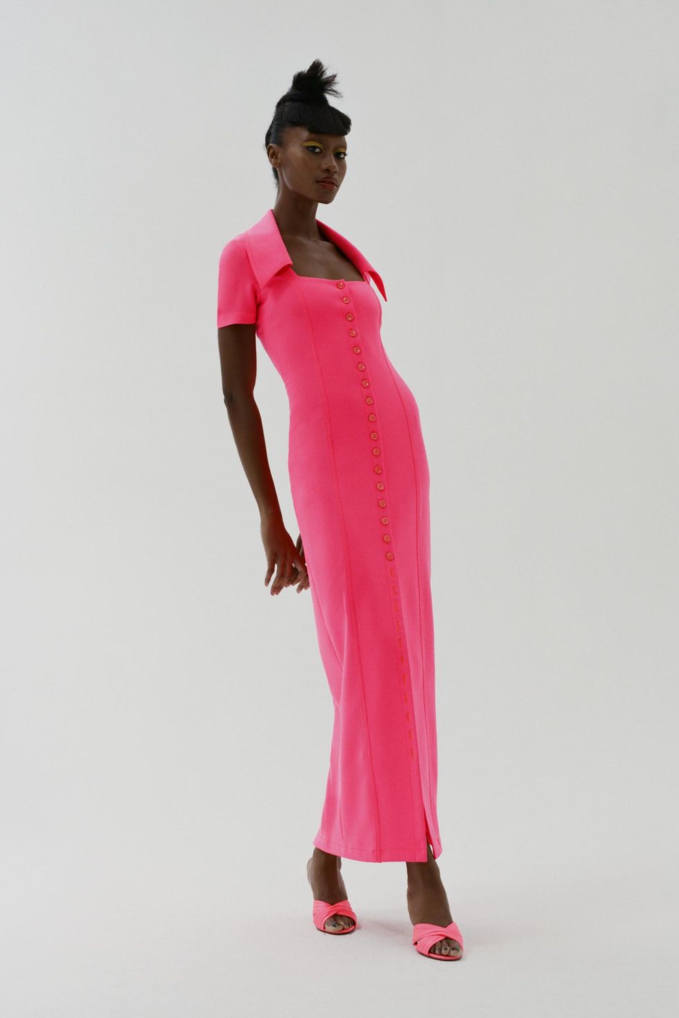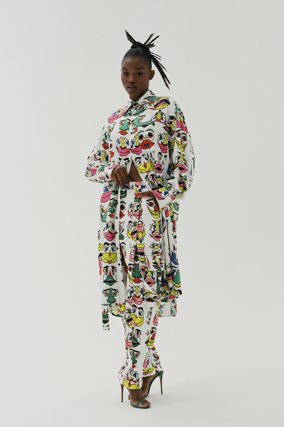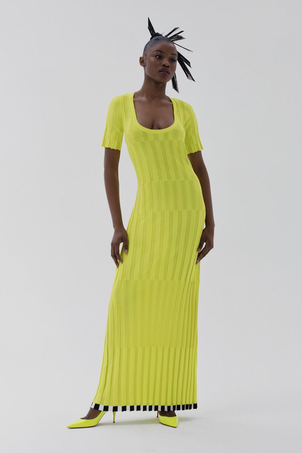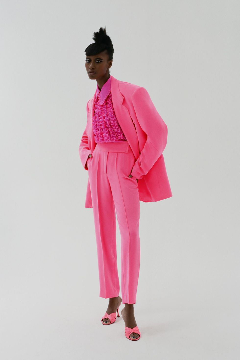 Neon hues of lemon yellow, electric pink and varying greens ranging from chartreuse to emerald are present throughout the entire collection. Hand-drawn polka dots across wardrobe staples, marker scribbles on trench coats and louder-than-life prints appear throughout the 40 looks.
