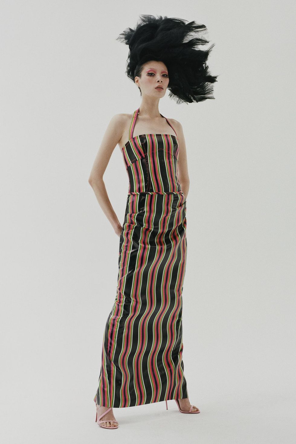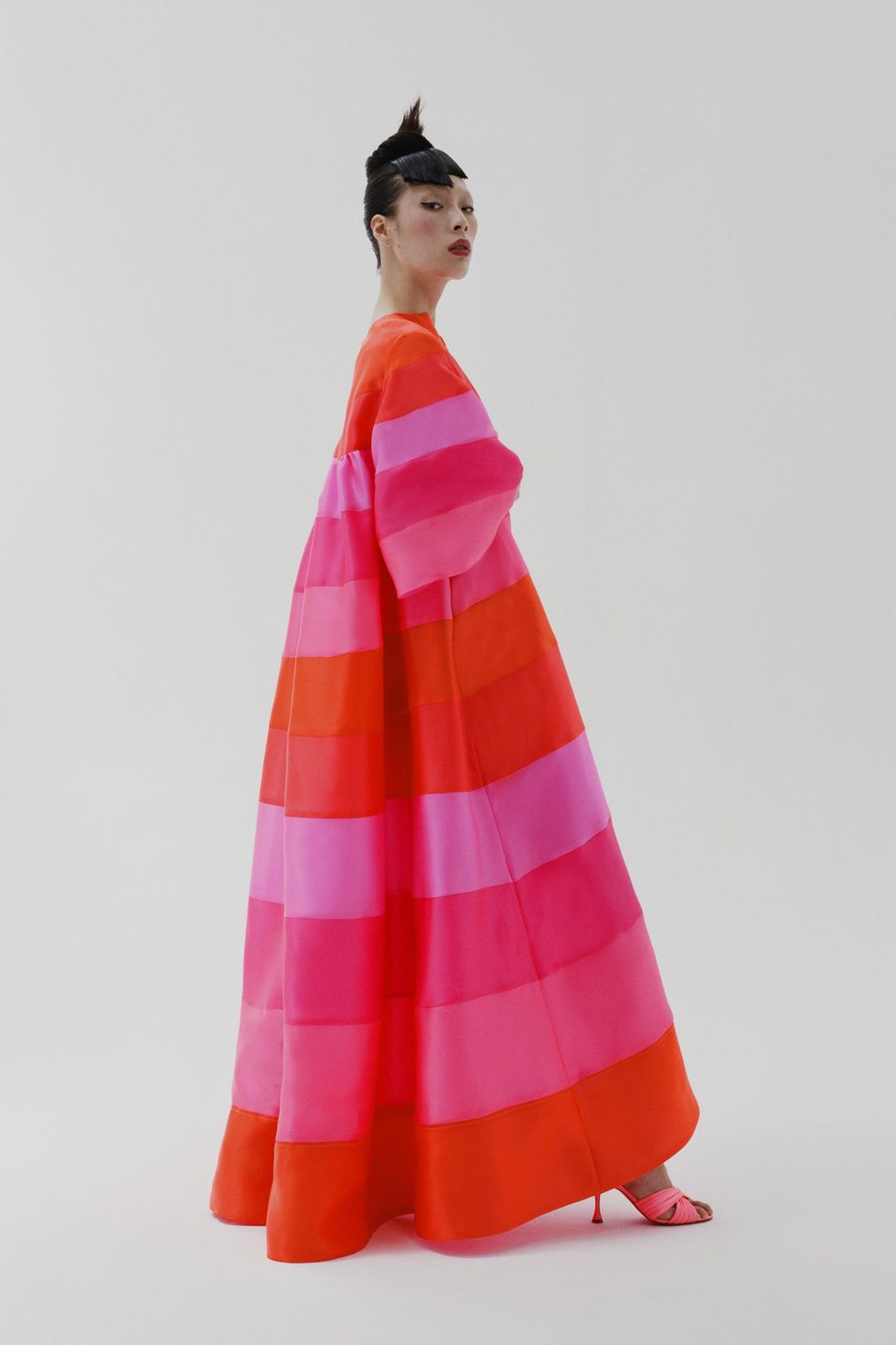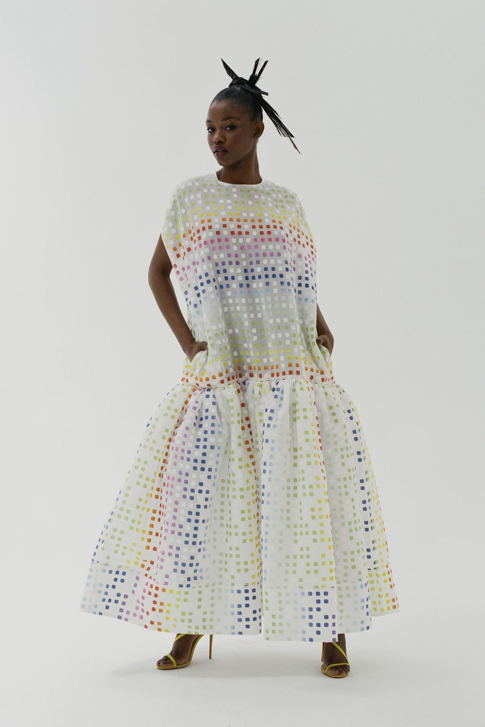 Rainbow stripes of vertical and horizontal proportions have a special place in Rogers’ life. Stripes were one of the few prints the designer felt comfortable wearing growing up. Varying styles of elevated supersized, mini, pieced together and print stripes are seen on various frocks.