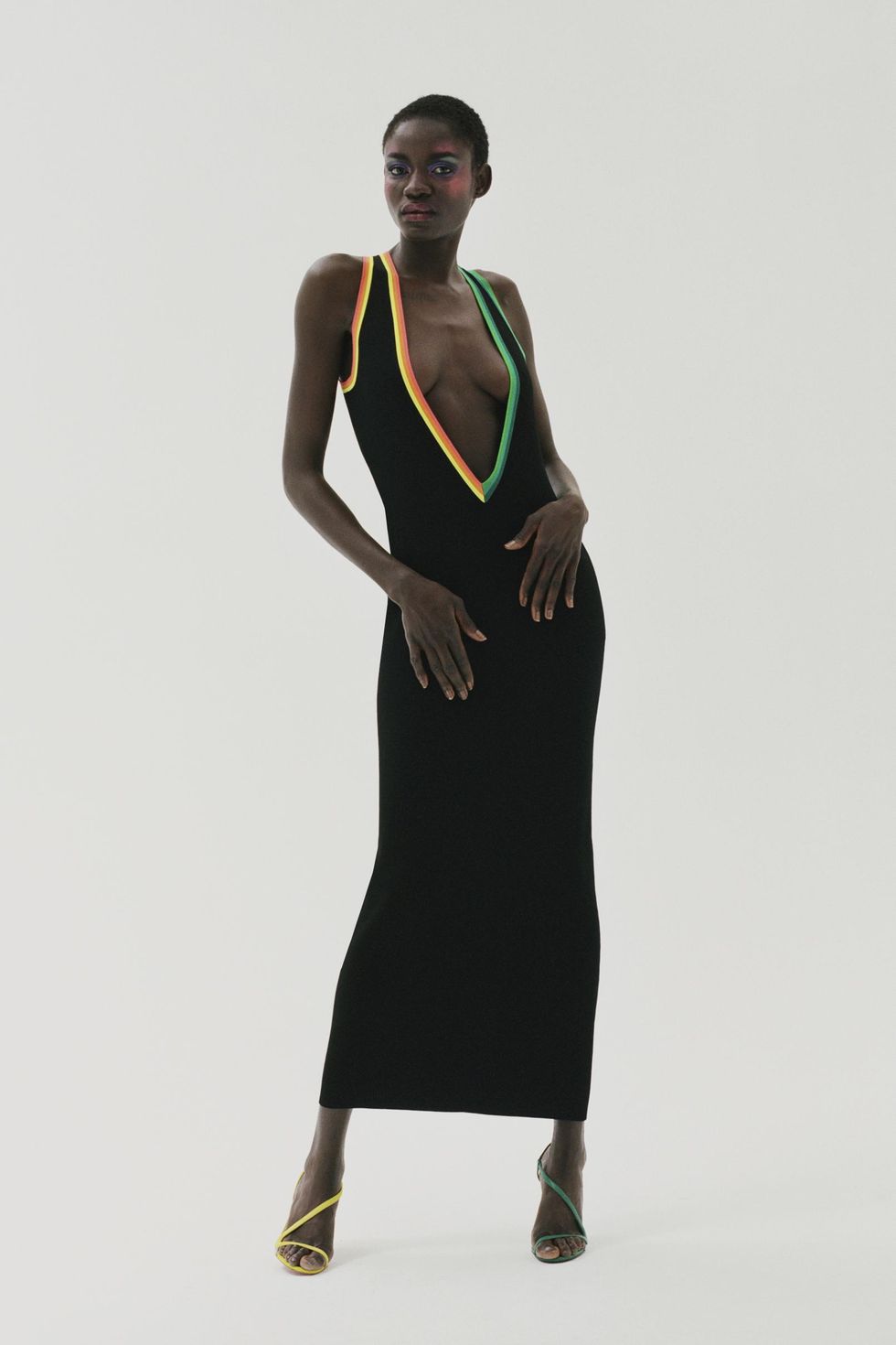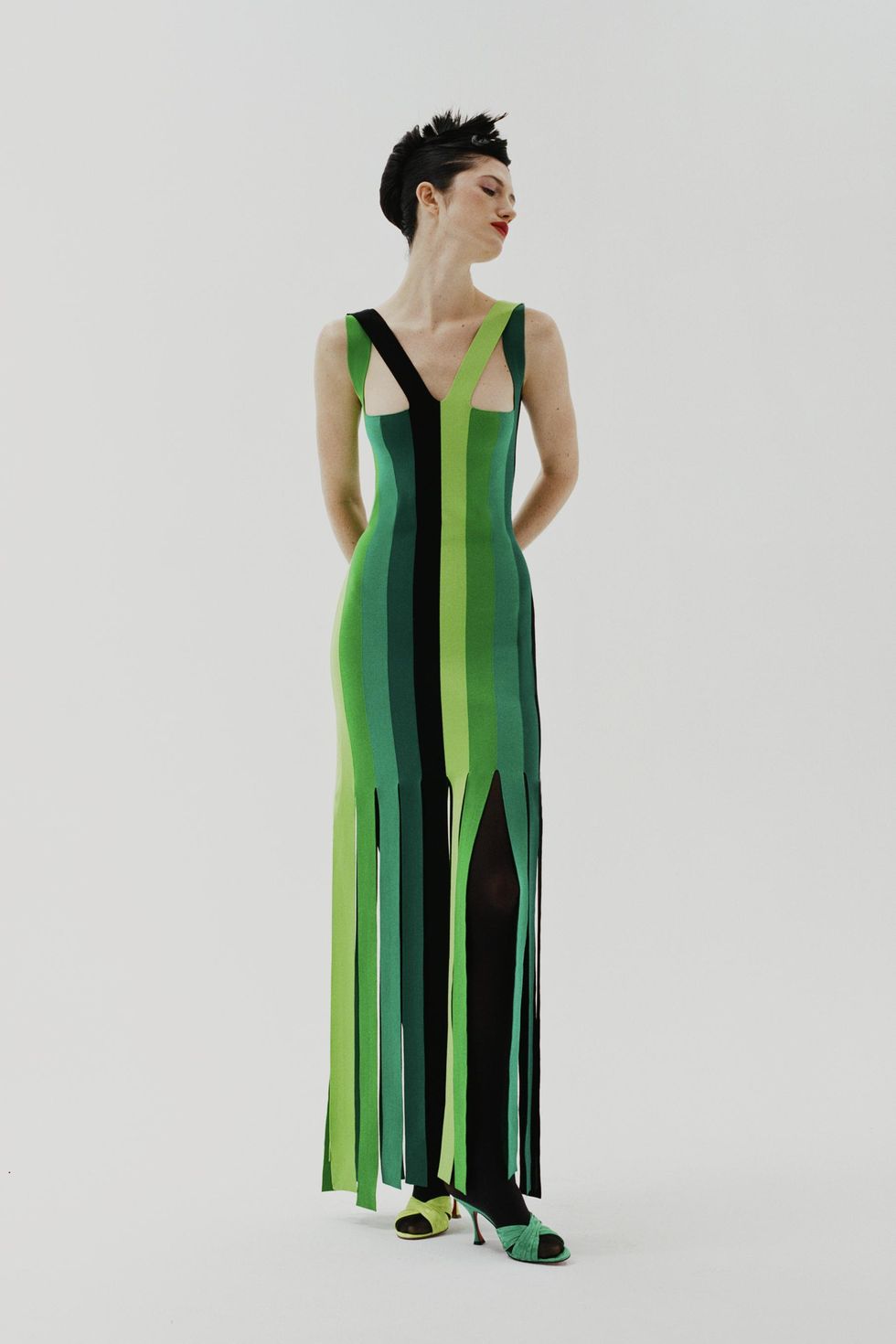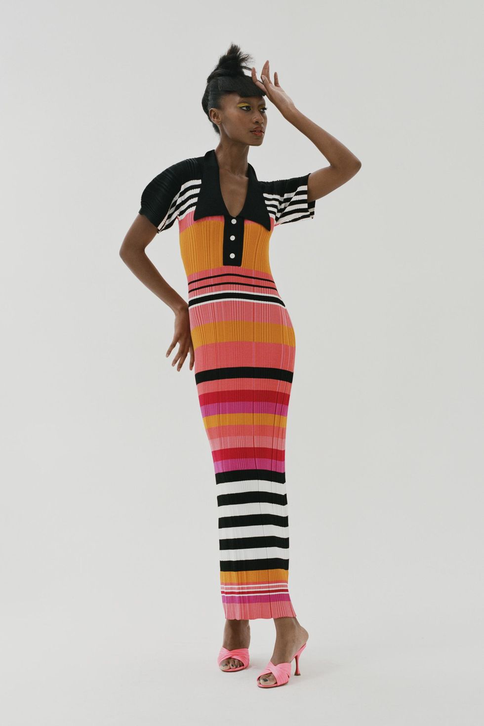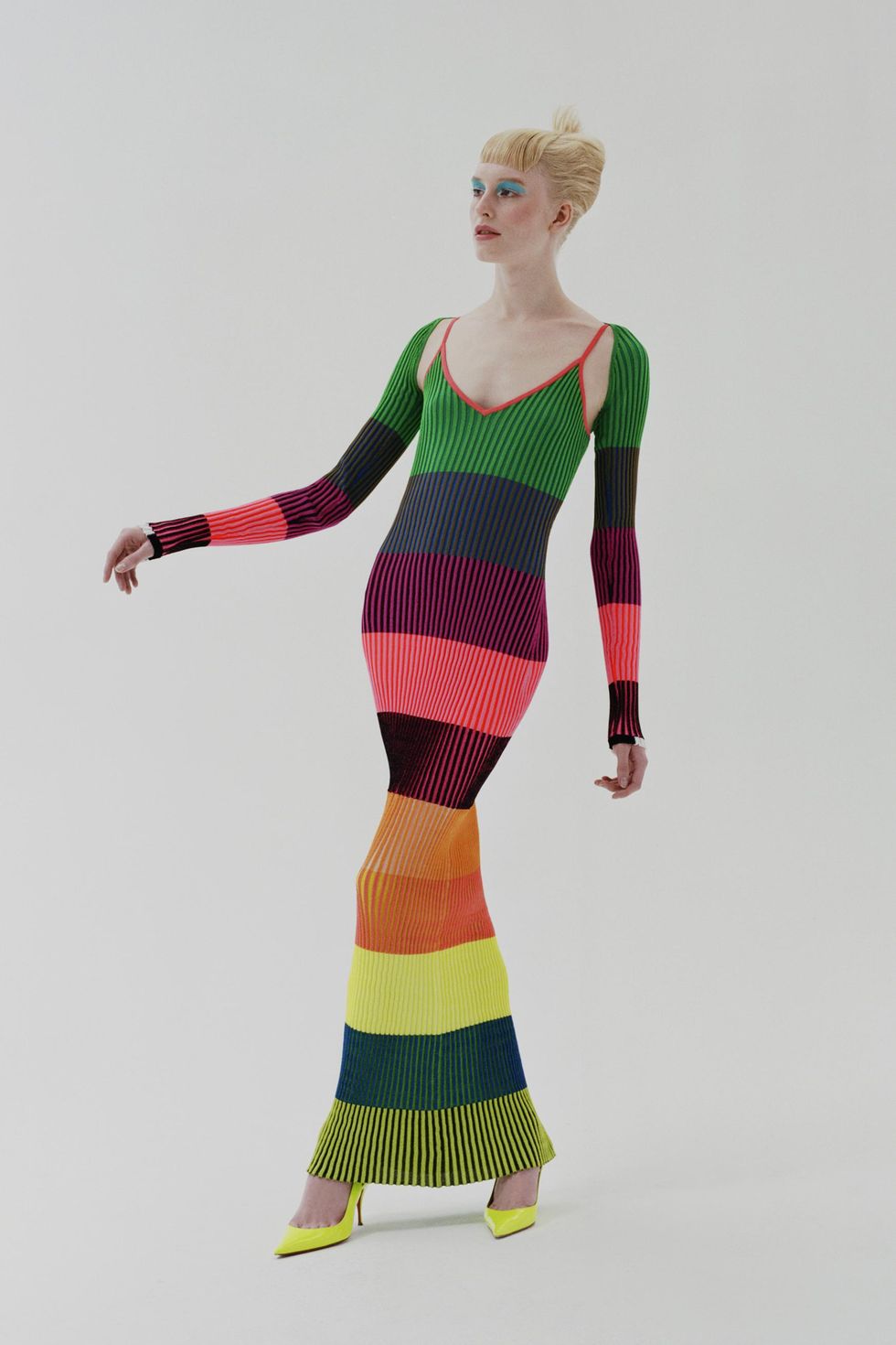 Rainbow stripes of vertical and horizontal proportions have a special place in Rogers’ life. Stripes were one of the few prints the designer felt comfortable wearing growing up. Varying styles of elevated supersized, mini, pieced together and print stripes are seen on various frocks.