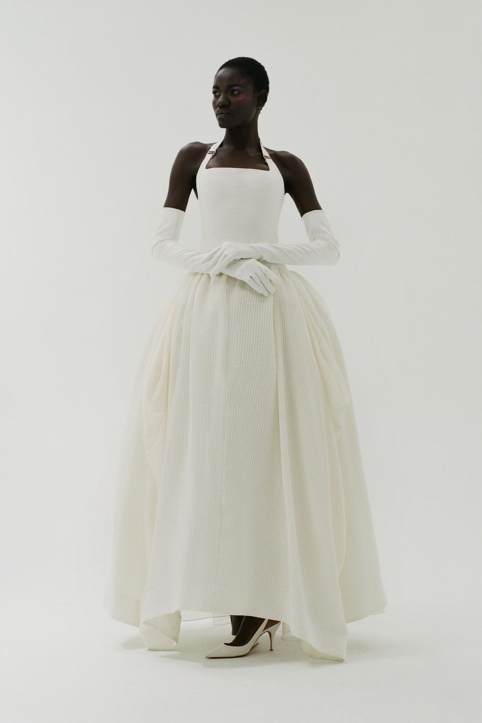 Inspiration came this season from a myriad of places: his childhood in Louisana, American preppy-ness, Southern propriety, video games and second-hand stores. Rogers has cited paper balls, trash bags, and synthetic carry-out bags as his points of reference when making this collection. Not shocking to those familiar with Rogers’ work is his ability to take the most unlikely of source material and transform it into voluminously elegant silhouettes.