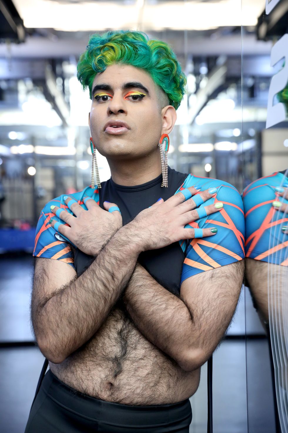 Over in the makeup department, MAC makeup artist Fatima Thomas was churning up her own rendition of athletic looks. The artist paid homage to vibrant athletic sneakers immortalized by streetwear-obsessed teenagers and the hypebeast Soho/ Bushwick-adjacent crowd alike by crafting identical designs on the lids with graphic liner.