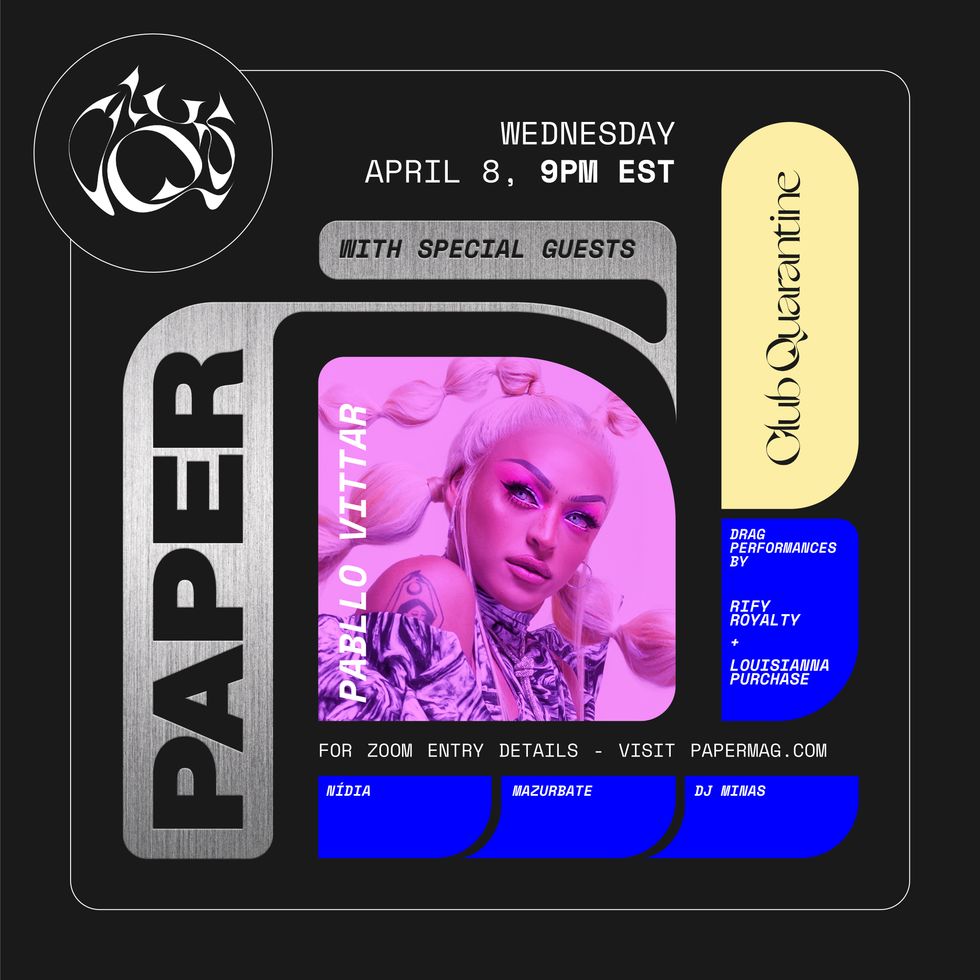 At 9 PM EST, PAPER x Club Quarantine will open, and feature special guest Pabllo Vittar, who just recently released her album 111 with collaborators like Thalía and Ivete Sangalo. The drag superstar will be joined by three DJs: Nídia, whose 2018 album Nídia É Má, Nídia É Fudida, garnered her fans like Kelela and Yaeji; Mazurbate (AKA Matthew Mazur), who's Kim Petras' stylist and an all-star in the NYC nightlife circuit; and DJ MINAS, a rising cult favorite from Ecuador. Drag performances by Rify Royalty and Louisianna Purchase will round out the party, which is three hours long, and hits capacity at 1,000 guests.