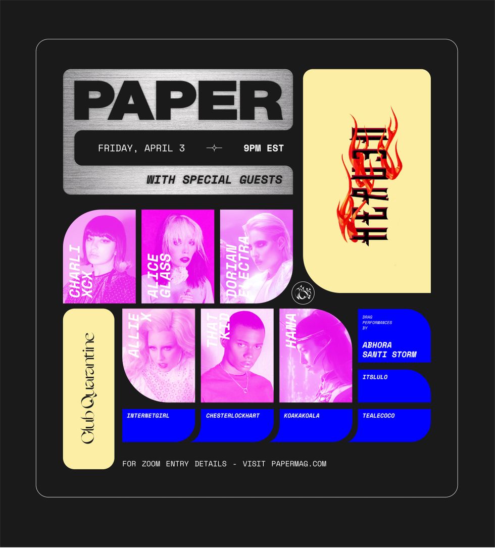 For entrance into PAPER x Club Quarantine With HEAV3N, you'll need a Zoom code, which will be announced to the public right here tonight at 9 PM EST. Stans, you'll want to watch this space closely — and run, don't walk, to enter the party.