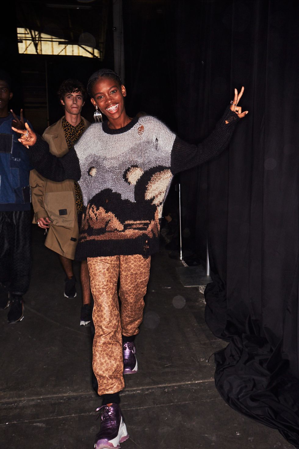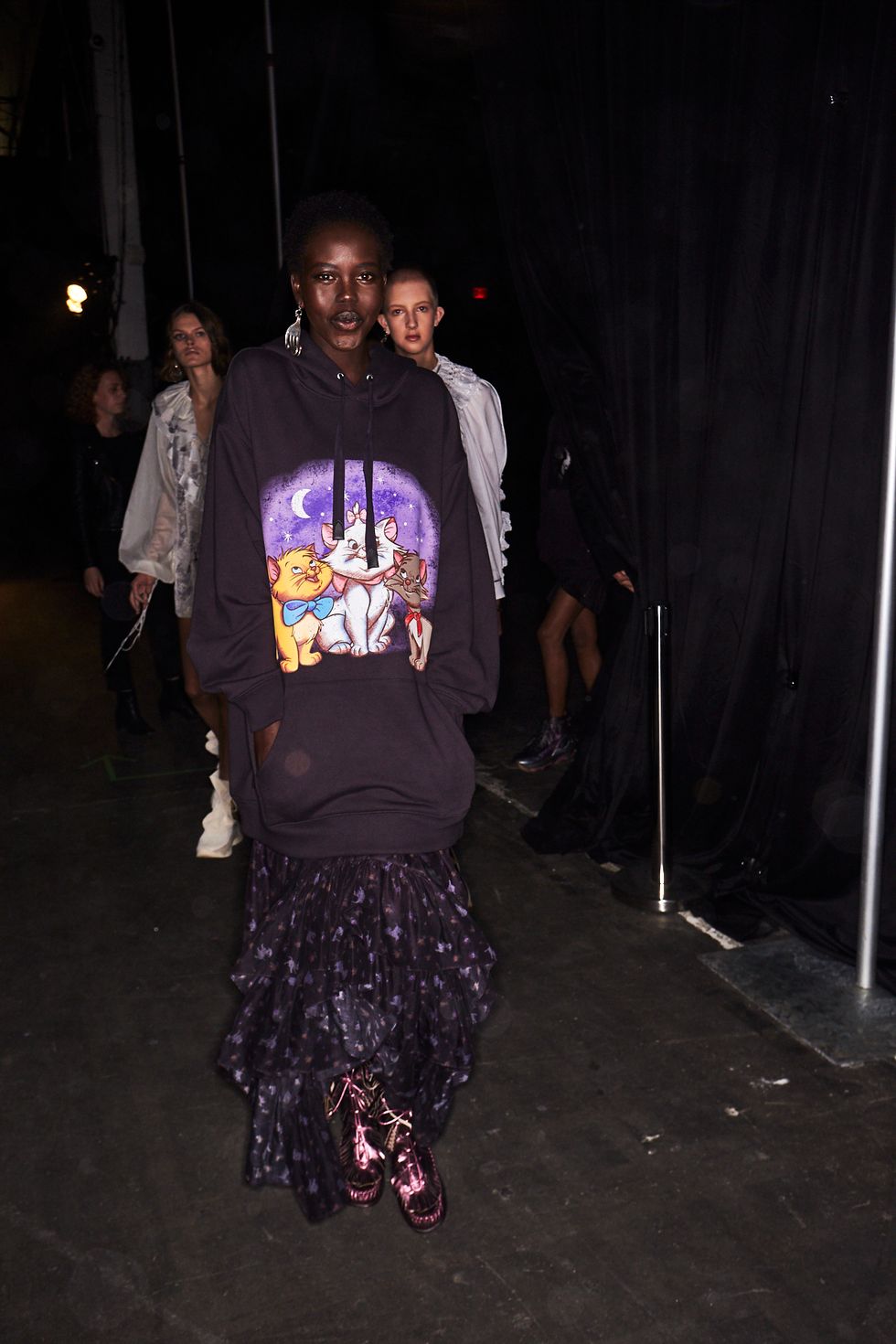 Vevers put a playful, eye-catching spin on his collection by sprinkling iconic Disney characters throughout. Dumbo the Elephant and Peter Pan crocodile Tick Tock were translated to intarsia knit sweaters, while Bambi and the Aristocats became prints for oversized hoodies.