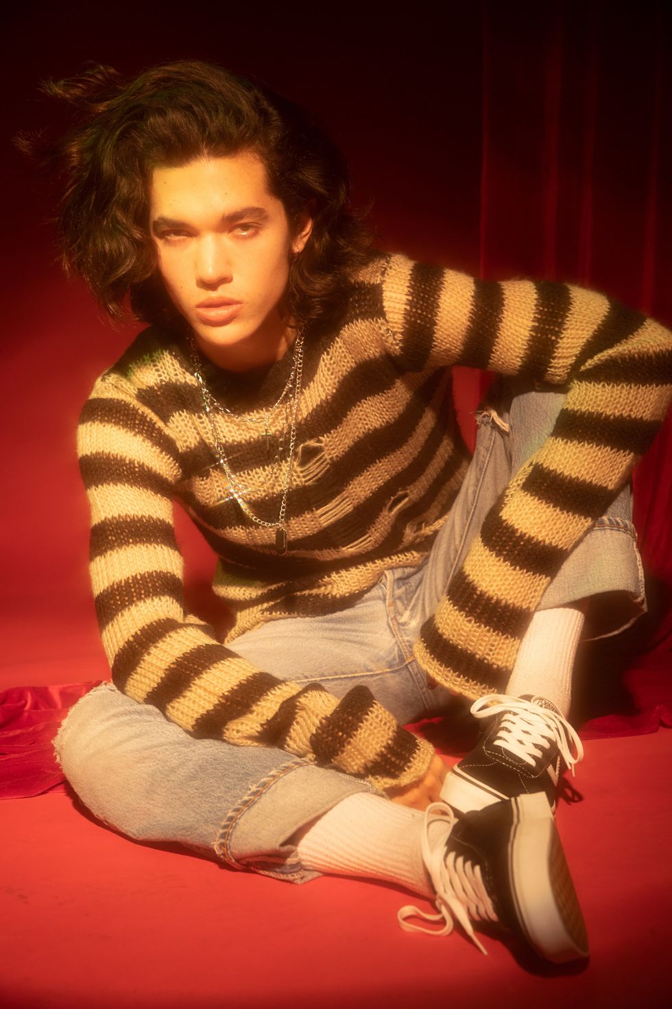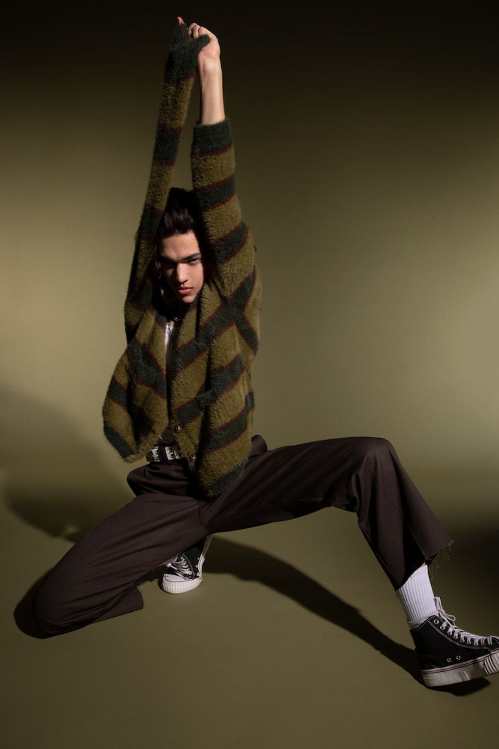 Gray has been living a compressed life since he released "Idle Town" three years ago, moving from Texas to pursue filmmaking at UCLA for less than a semester before leaving to pursue music full time. He remembers how he began with that first song, layered with self-harmonies and malaise, and built "this whole world out of basically nothing." His transition between internet stardom and mainstream fame was fast and, as a result, blurred. While his early musical efforts garnered attention from his existing subscribers, he hadn't anticipated the new devotees: "When I started touring I hadn't realized that I'd actually gained a pretty large following until I literally had to go onstage and sing to them." Despite Gray's ease in front of the camera, he's still not comfortable with the praise that comes with a legion of fans, many of whom have been with him for years. This self-abasement is central to his appeal, calling out to shy teenagers who see themselves in him. "I fucking hate getting compliments," he says. "Oh my god, bury me, I hate that. I hate when people talk about me."
