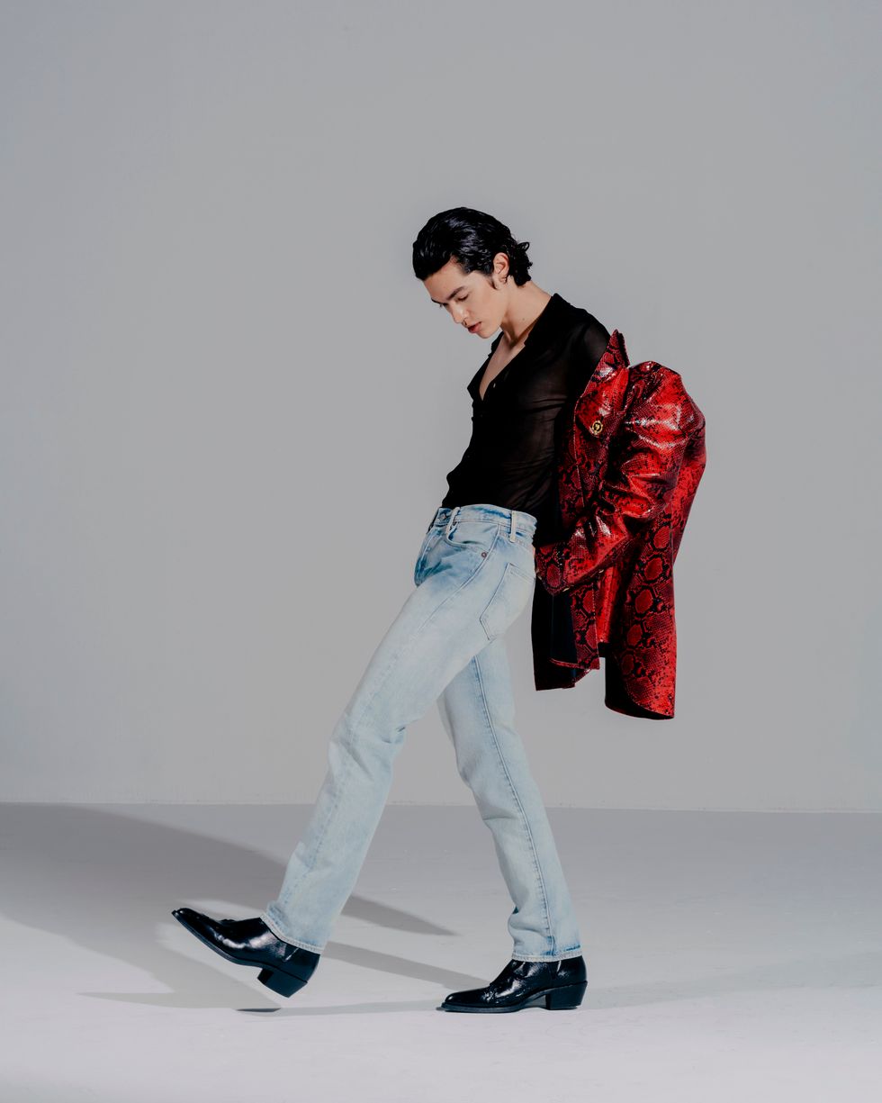 Jacket & Top: Versace, Jeans; Levi's, Shoes: Saint Laurent