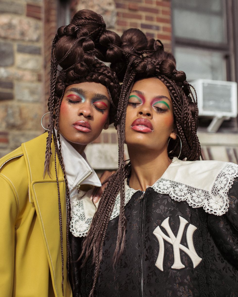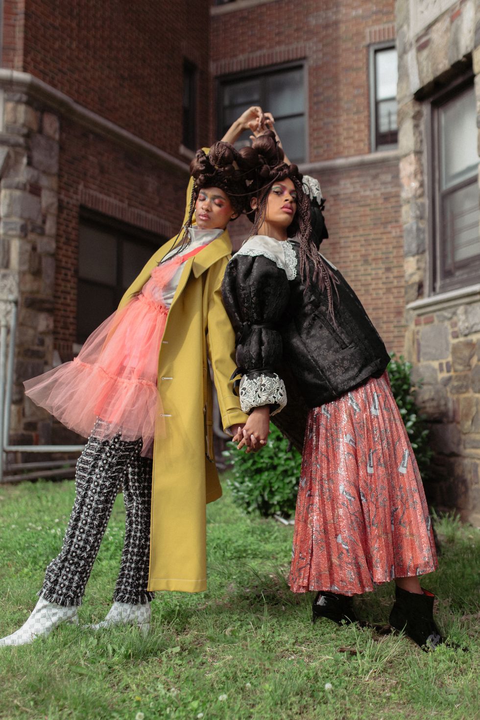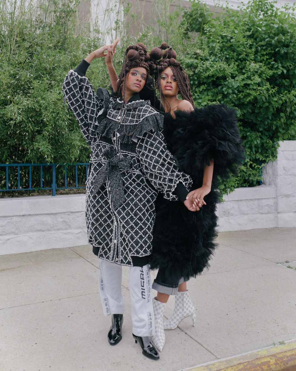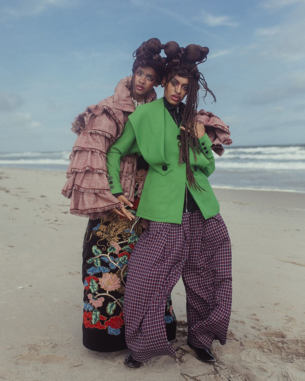 On Mecca: Jacket by Laurence & Chico, Top by Noon by Noor, Skirt by Gucci, Shoes by MISBHV; On Annahstasia: Jacket by MISBHV, Blazer by Claudia Li, Pants by Laurence & Chico, Shoes by 3.1 Phillip Lim
