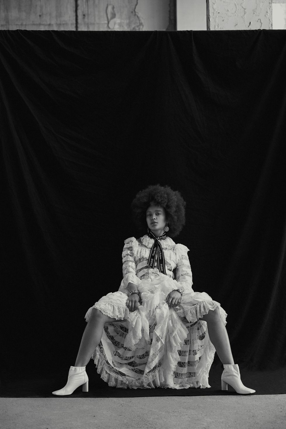 Dress: Ryan Lo, Neck Ribbon and Earrings: Dior, Shoes: Eudon Choi, Cuffs: Merola