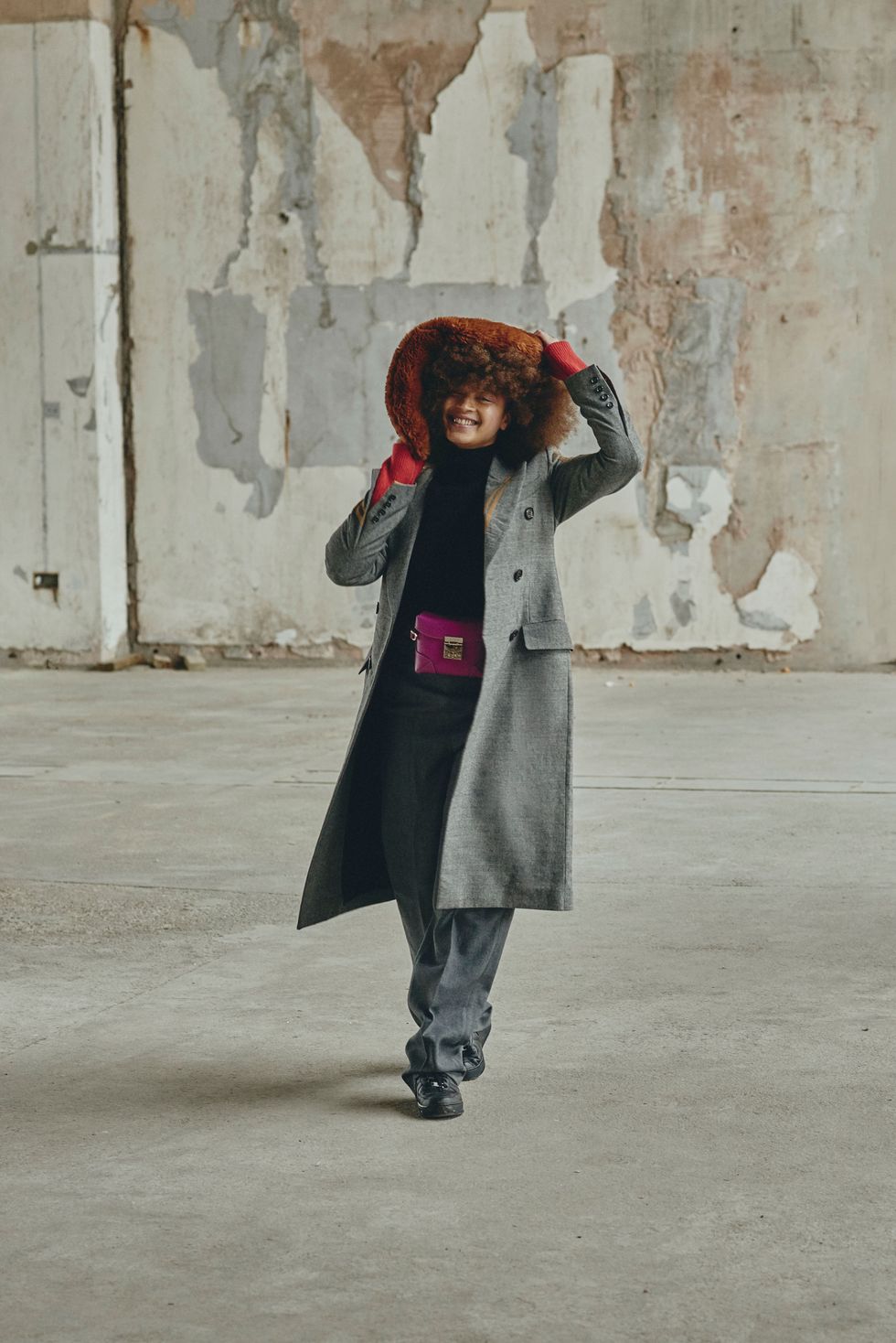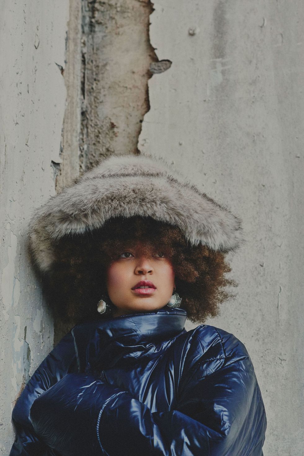Coat: Norma Kamali, Earrings: Merola, Hat: Emma Brewin