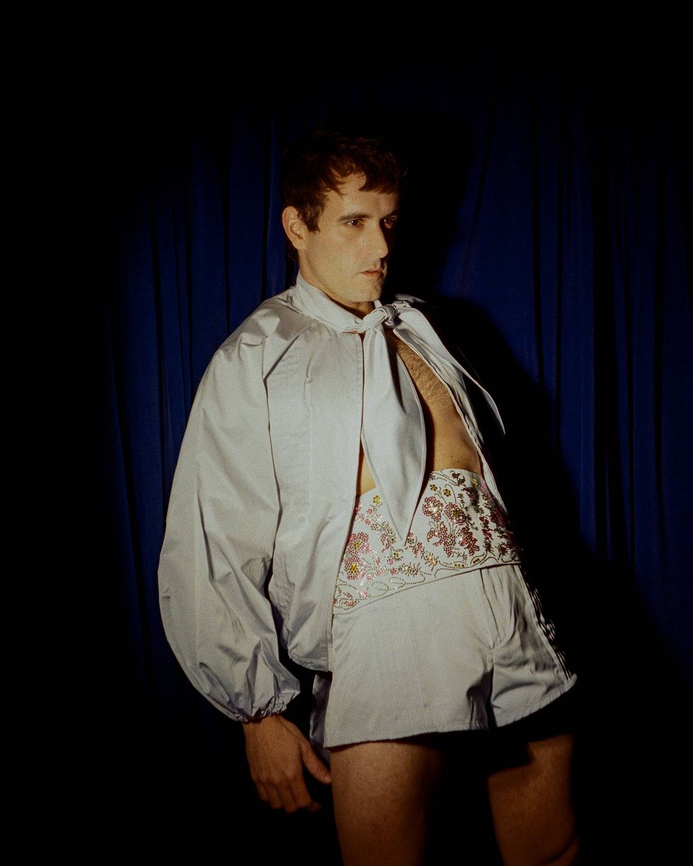 The good side and the bad side living together, not being ashamed from one another. Who you can be when you’re relaxed and in love, and who you can be when you’re eager for a crazy night out, exploring your sexuality with no limits and no inhibitions. Trying to find inspiration in the lightest places, in the most beautiful places — that’s why we leaned into such contrast with [our Cruising in the Rose Garden show]. We thought, we’re gonna create this cruising scene, but let’s imagine we’re doing this in the most beautiful garden in Versailles. It was about playing with whimsical and fetish.