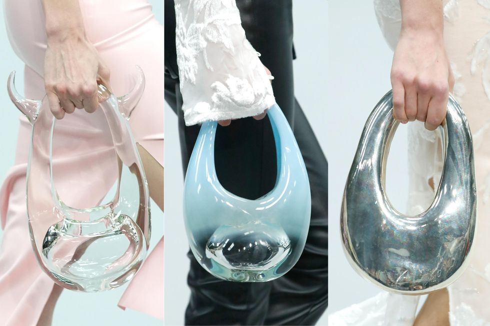 The sculptural accessories are a take on Coperni's signature oval-shaped Swipe bag and the result of a collaboration with New York-based glassware brand Heven. Its co-founders (and real-life couple) Breanna Box and Peter Dupont teamed up with Brooklyn Glass studio's Josh Raiffe to create the glass-blown works of art.