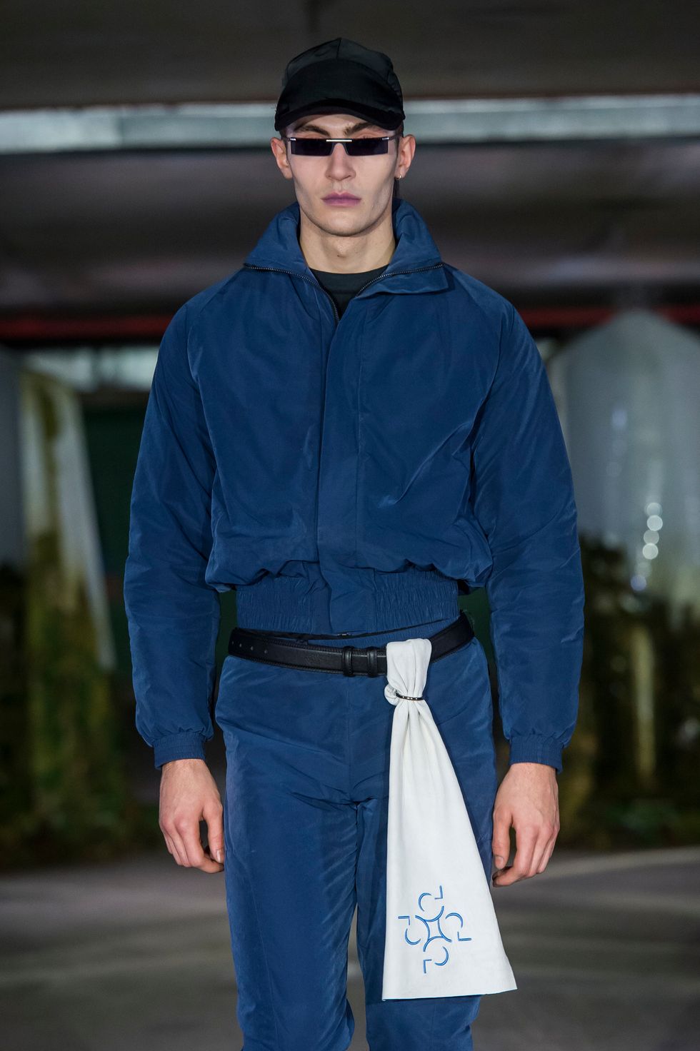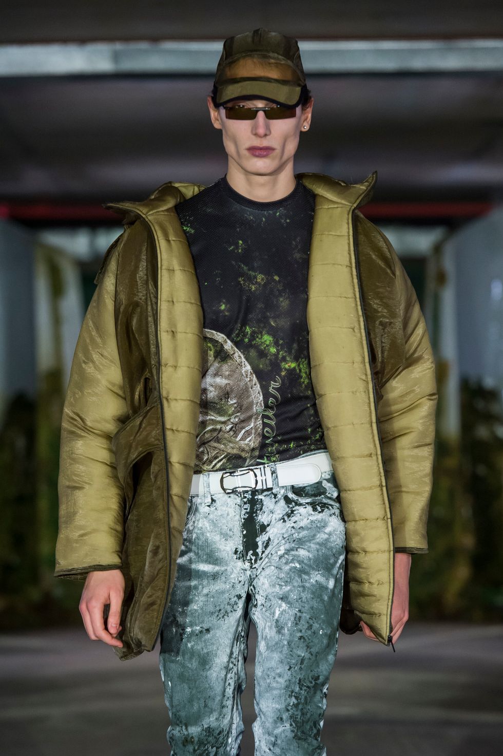 So to preserve cruising's lost art, Cottweiler's collection cleverly featured clothes in earthy tones and styles reminiscent of the era it evokes: shades of green, black, and midnight blue are mixed with bold, arty, and very gay prints. To really riff on the theme, there are eighties gay daddy/club kid staples like high-waisted acid-wash jeans, jumpsuits, silk shirting, sporty hats and trousers, and chunky athletic footwear.