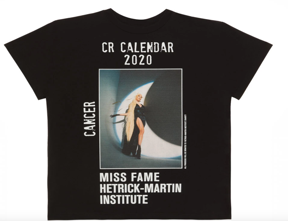This year, the prestigious CR calendar takes form in a series of T-shirts — 12 to be exact, one for each month of the year — which is printed with each model and their corresponding zodiac sign. The total proceeds for the shirts go to a charity of the model's choosing, and Miss Fame (a Cancer) chose the Hetrick-Martin Institute, the country's longest-running service organization dedicated to LGBTQ+ youth.