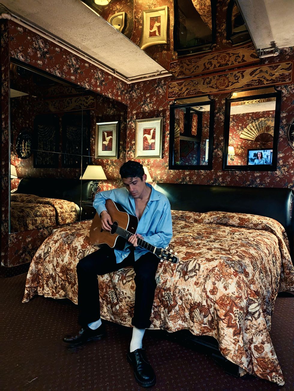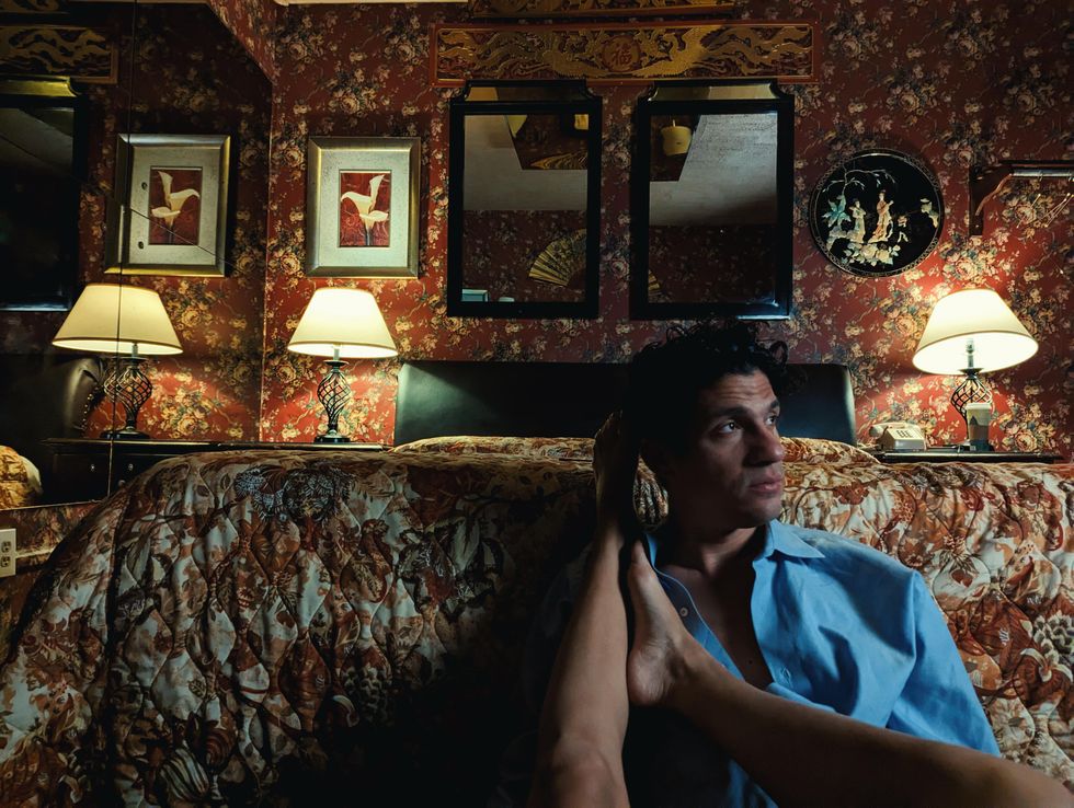 In this photo, there’s this subtle look in his eyes, a real vulnerability to it. A twinkle of heartbroken, sedated, aloof and pensive all mixed in one. A home is a person, not a physical space, which is why I chose this love motel in Queens, as a sort of transient and lonely destination. I chose a room oozing with red because the color broods passion, a beating heart, the blood rush that comes with sex, a birth and pain.