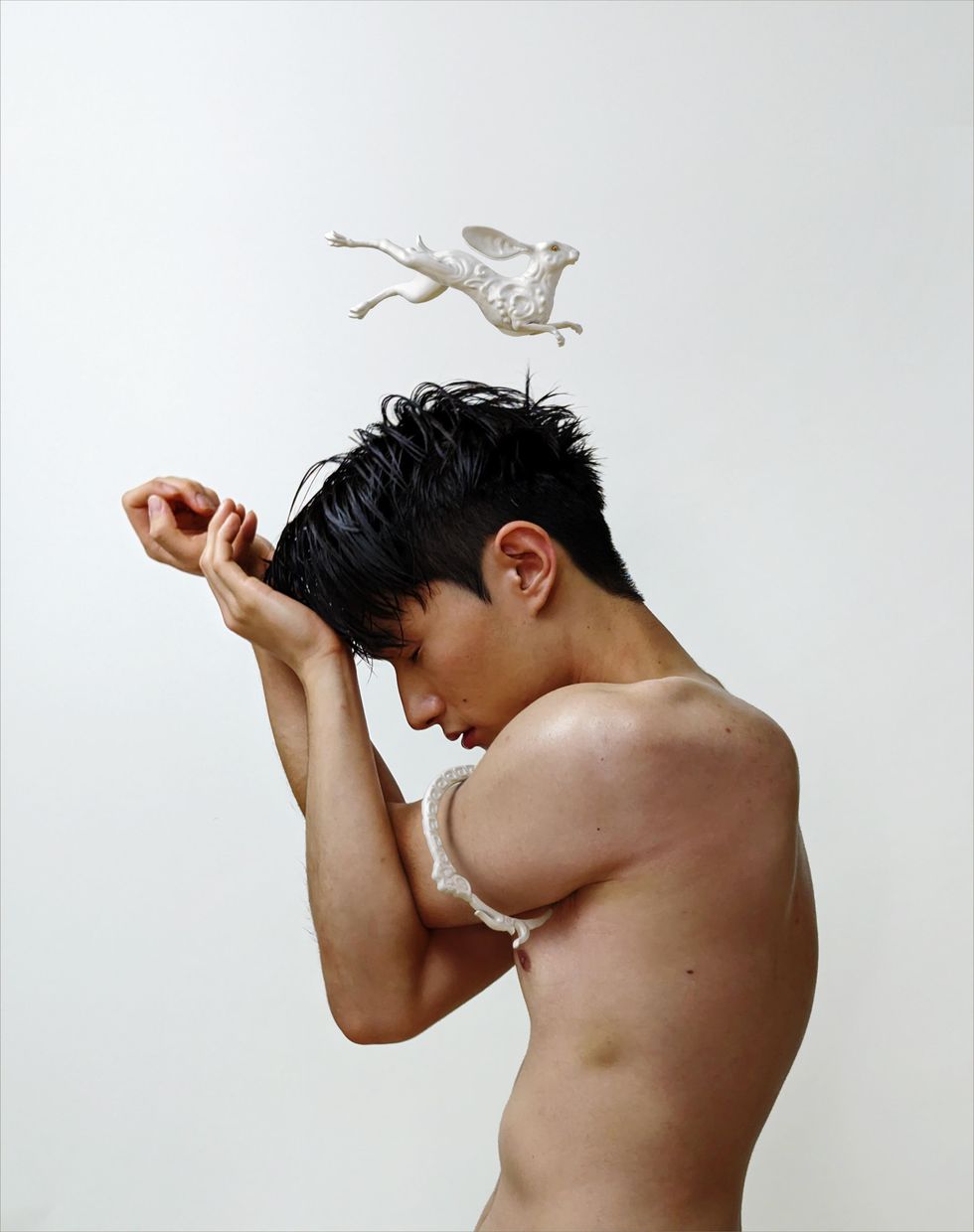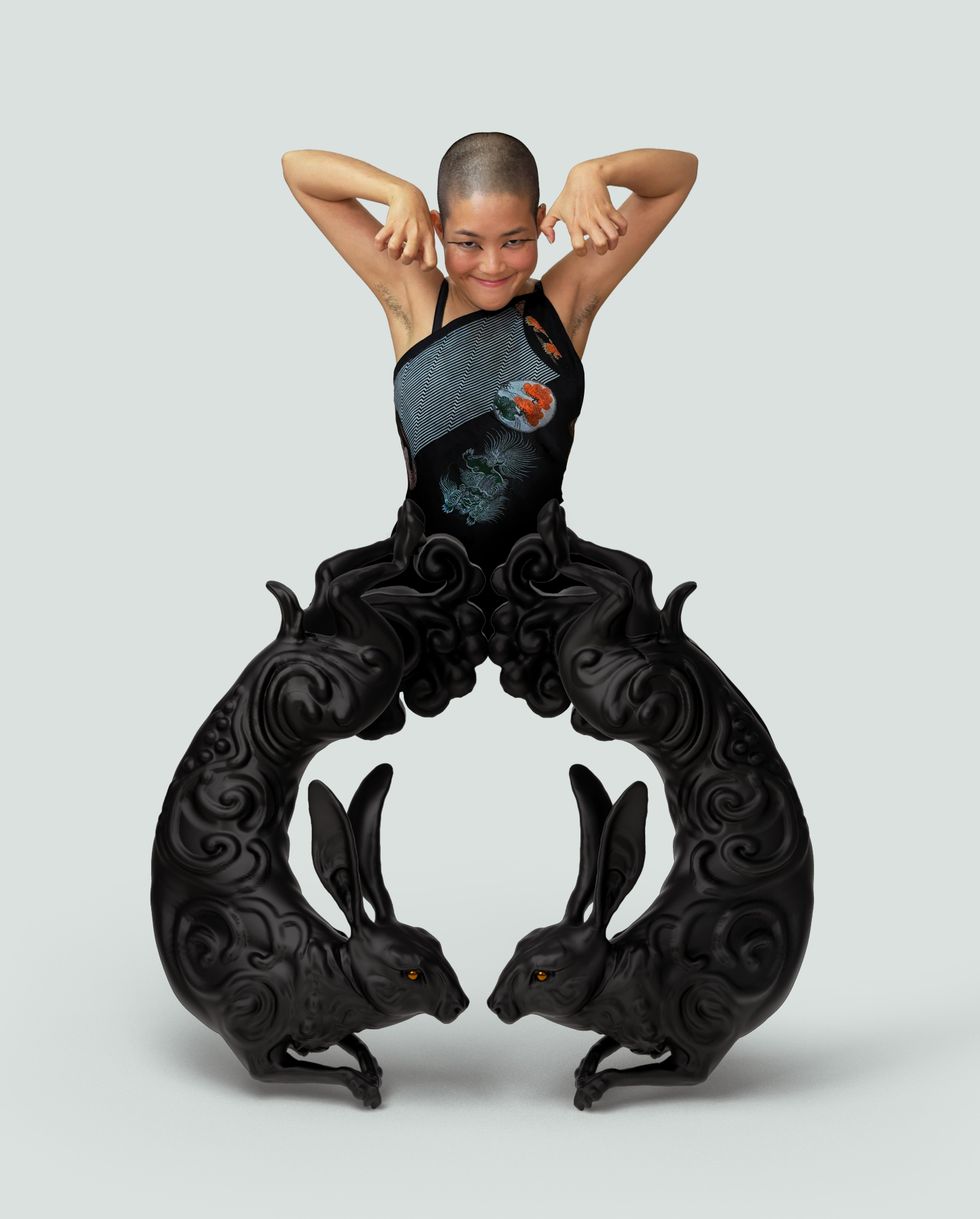 My goal was to frame queer Asian portraits in the context of the new lunar new year, the Year of the Water Rabbit. There are twelve animals in the lunar zodiac and five elements (water, wood, fire, earth and metal) that rotate in a sixty-year cycle. I love astrology and the lunar calendar is something ancient that ties our AAPI communities together. In Taoism, the color symbol for water is black, so I mostly wanted to frame the models with black rabbit sculptures reminiscent of ebony Chinese lacquer work. So, these are rabbit portraits for the new year 2023, which I hope brings us all joy and opportunities for growth.