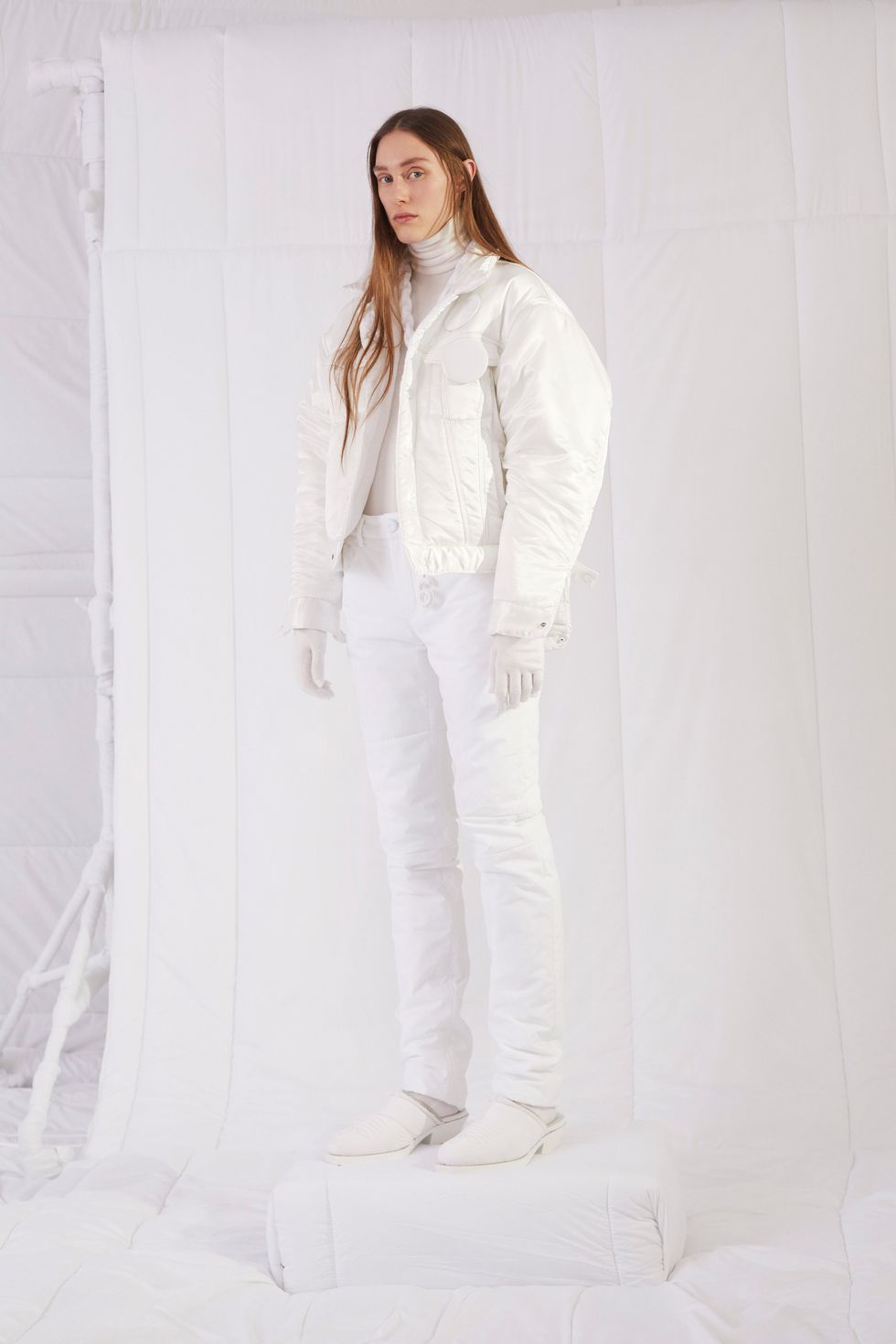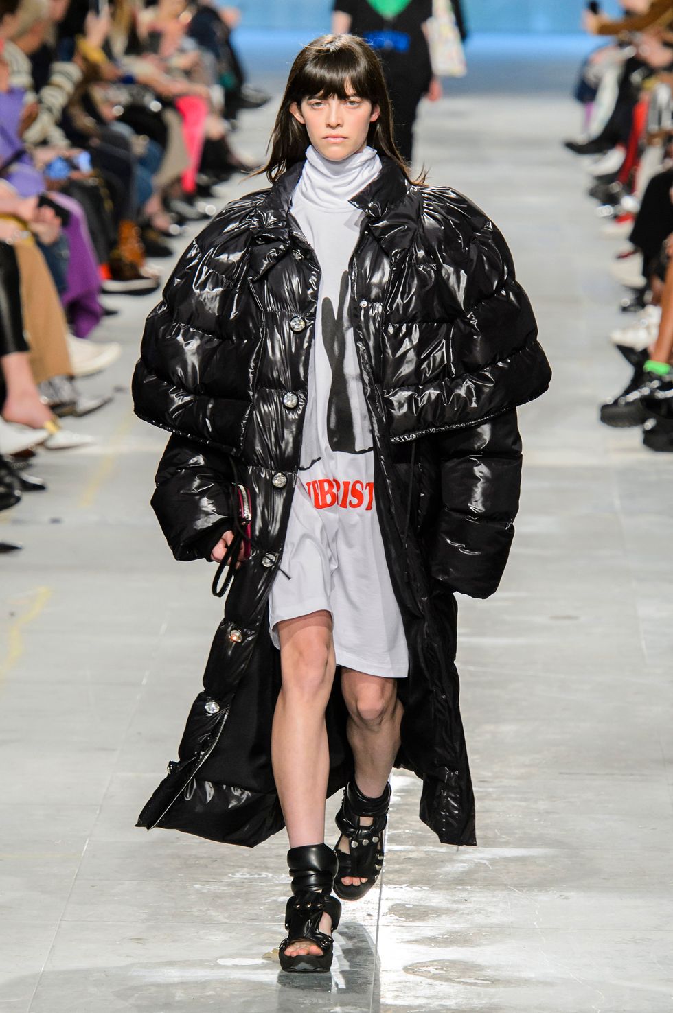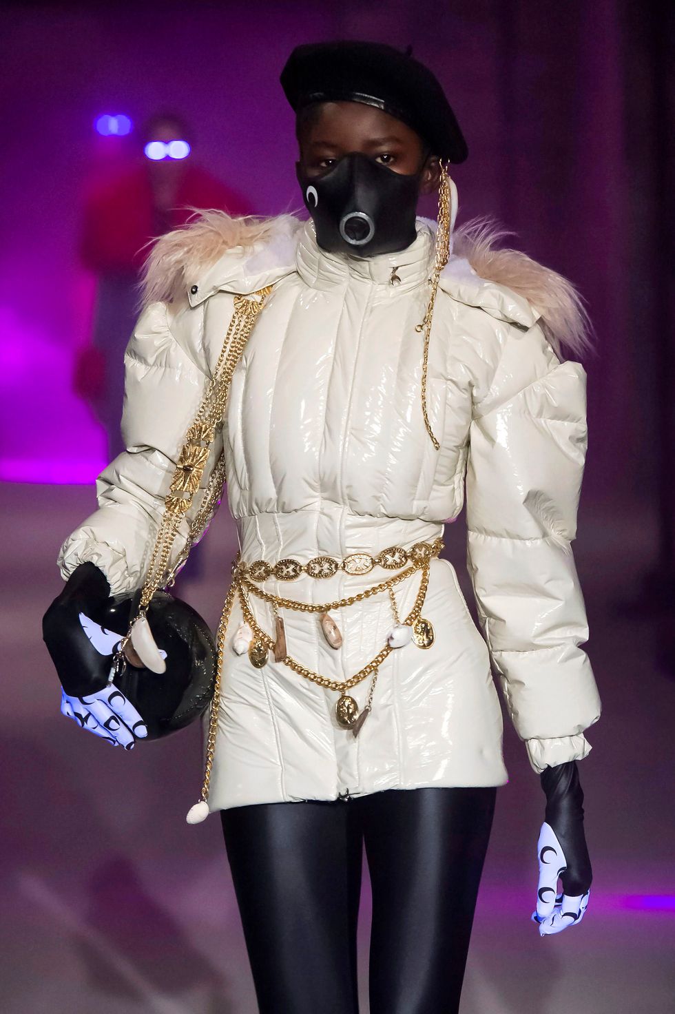 My beloved Marine Serre showed puffs today that had been transformed into poofy mini-dresses; one was cropped with a structured middle section that sent me back to early 2000s-era video girls. Ottolinger did a baby puff with a tightly cinched waist, and versions of a parka that felt almost tailored, like they were ready for the slopes of Gstaad. MM6 Maison Margiela's take came in blinding white; Christopher Kane's black version had it both ways, trailing to the model's ankles with a cropped bolero-like overlay. Every influencer's (including North West) favorite brand, Saks Potts, showed puffs with luxurious collars that were short but not quite cropped, with matching ties at the waist.