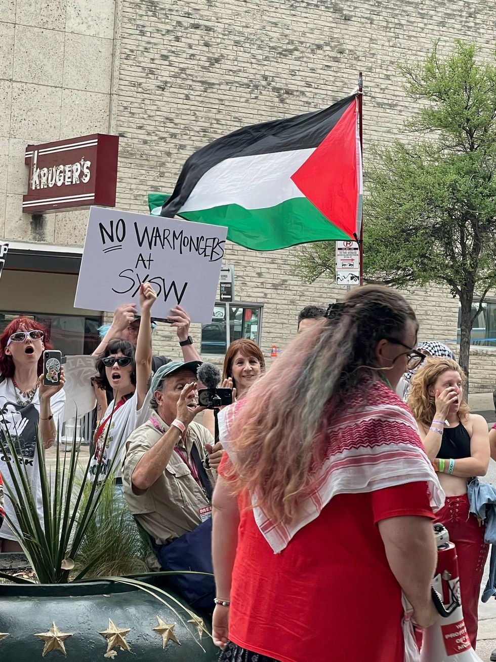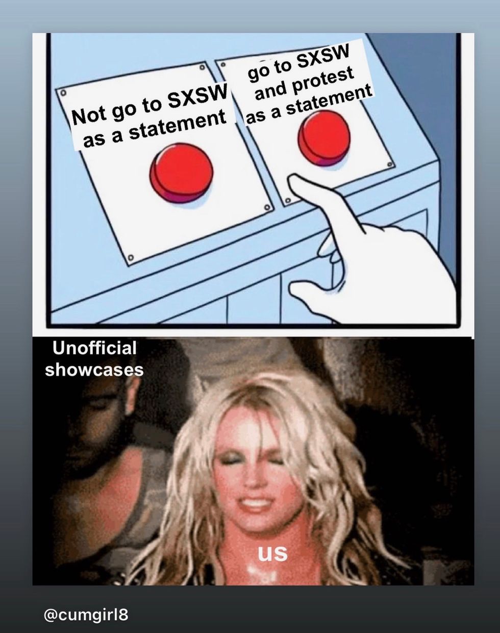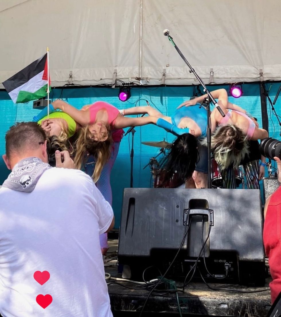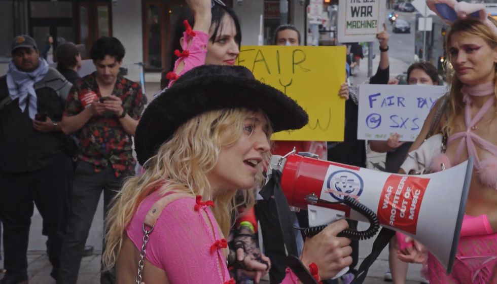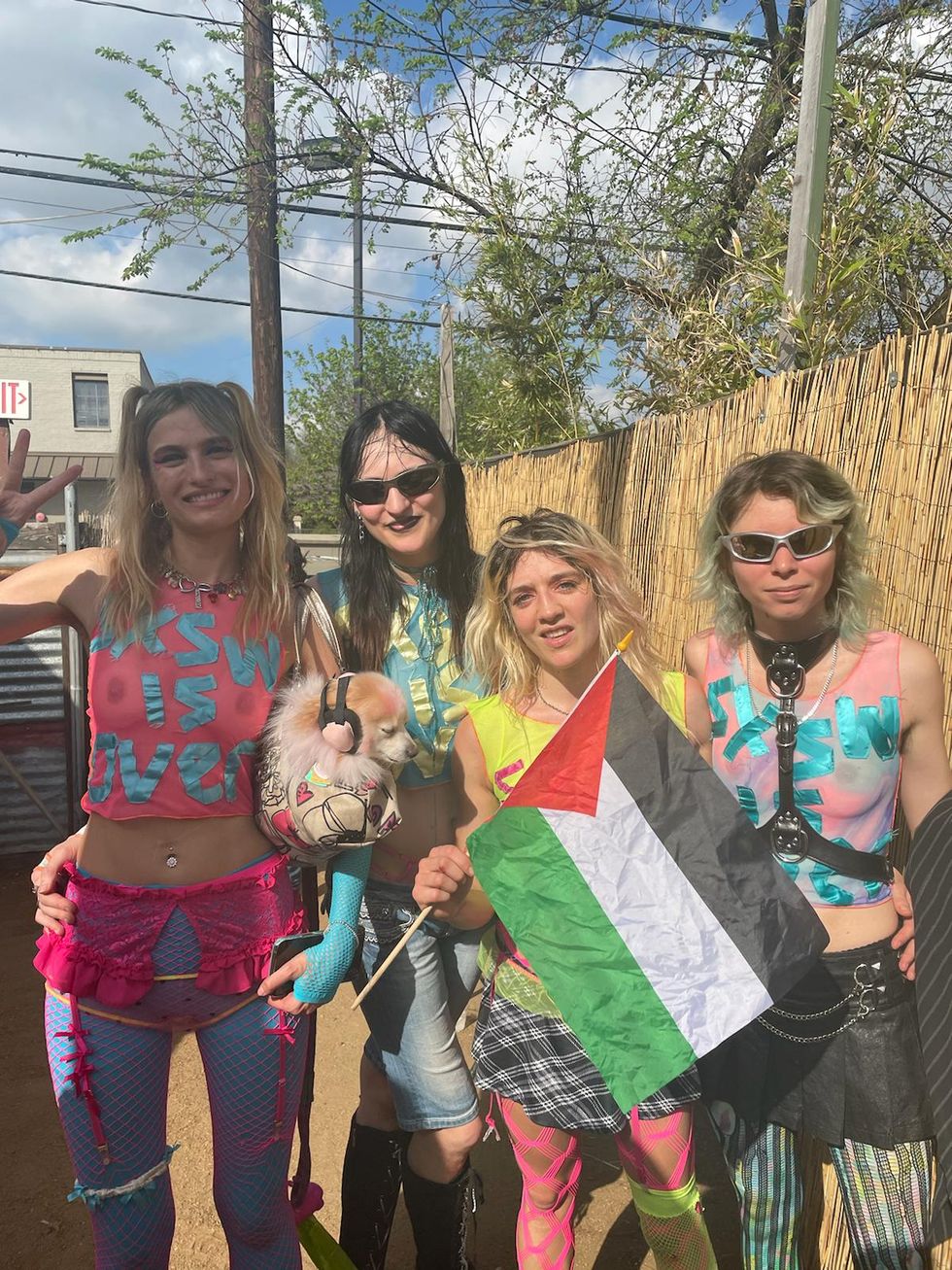 The New York-based post-punk quartet, known for their colorful style and gritty sound, is equally regarded for being outspoken on social issues. That’s why they had to carefully decide how to approach playing SXSW this year. In recent weeks, the mainstay fest has come under increased scrutiny for its exploitation of performers and, amidst the US-funded war in Gaza, its deepening relationship with the U.S. military. Instead of averting the festival completely, cumgirl8 entered the fray head-on and made their presence felt by dropping out of official SXSW shows, instead only performing at unofficial SXSW events. Moshing at a show while waving a Palestinian flag and attending a protest demanding that “war profiteers stay out of music,” cumgirl8 rallied fans and fellow musicians.