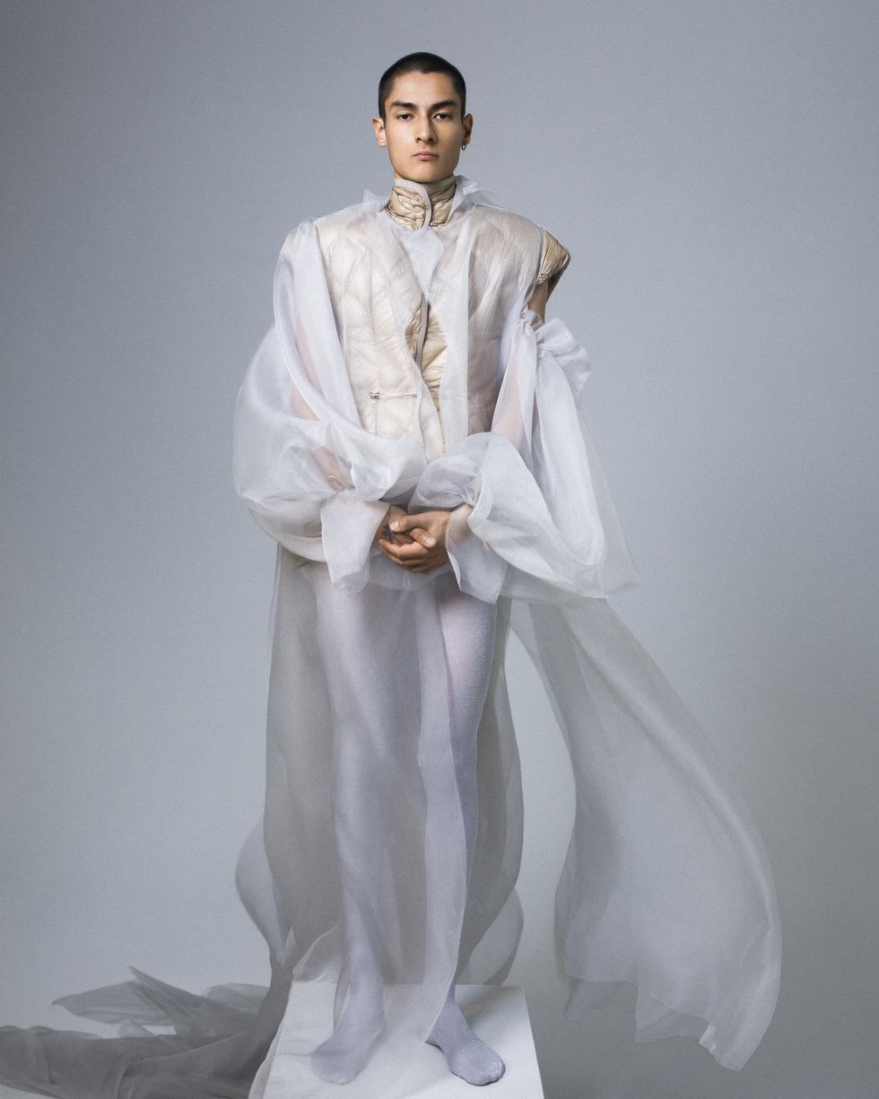 See, the three coats seem to tell different and separate parts of queer history. There’s a short corset puffer coat that is layered with sheer organza silk over it like an ethereal robe. Here, Cassel nods to historic fashion brands helmed by queer people, such as Alexander McQueen and Balmain.