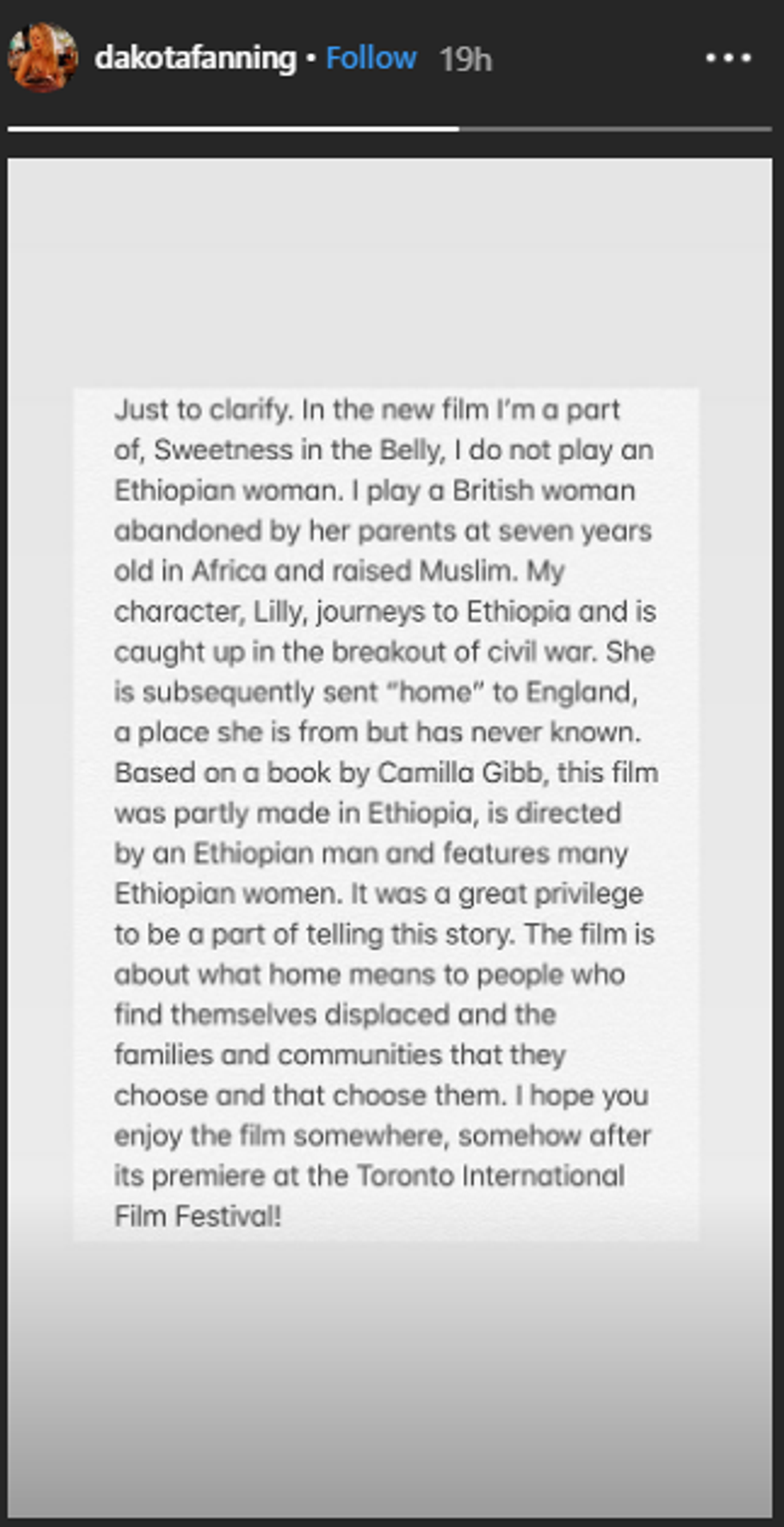 On her Instagram story, Fanning responded to the whitewashing claims and clarified that she isn't trying to portray another ethnicity. Adapted from the fictional bestseller of the same name, Sweetness in the Belly tells the story of Lilly, the daughter of white British parents who abandon her in Ethiopia as a young child. She eventually flees to the United Kingdom as a refugee during Ethiopia's civil war. The novel is written by Camilla Gibb, who is white and British, but Fanning noted the movie adaptation will be directed by Zee Mehari, who is Ethiopian.