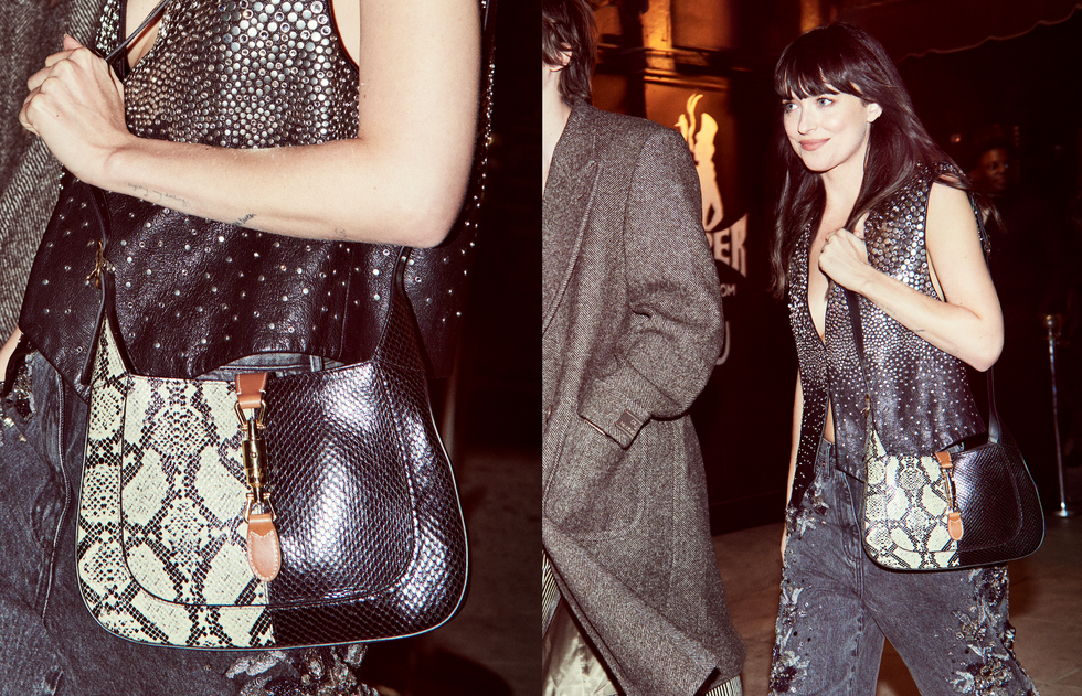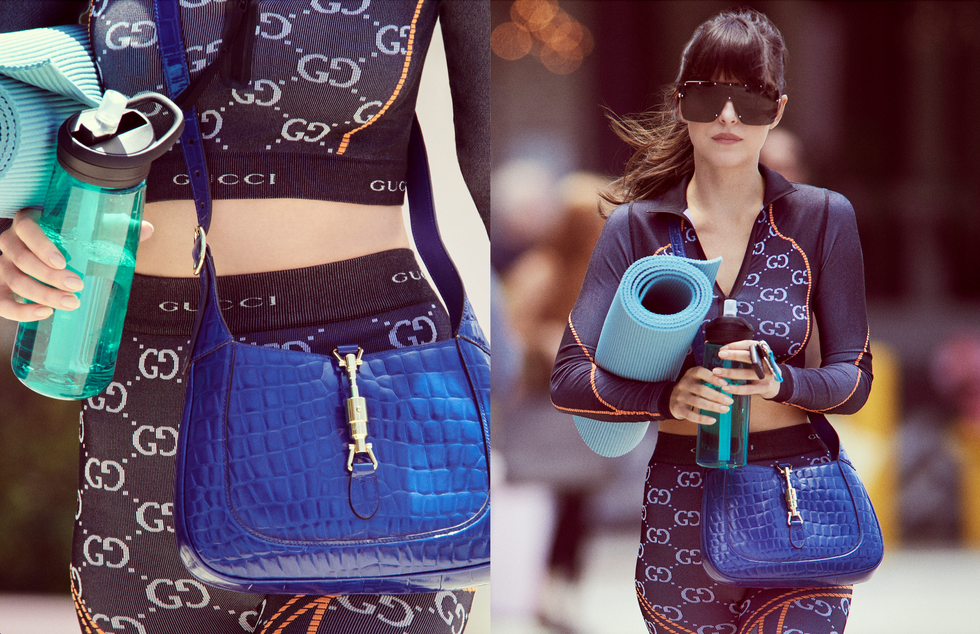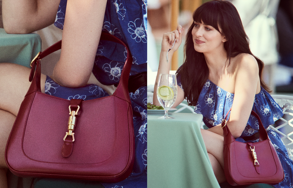 The photos and video, shot and directed by regular Gucci collaborator Glen Luchford, show Johnson "paparazzi'd" while casually sporting different versions of the Jackie bag, including a dazzling blue croc style.