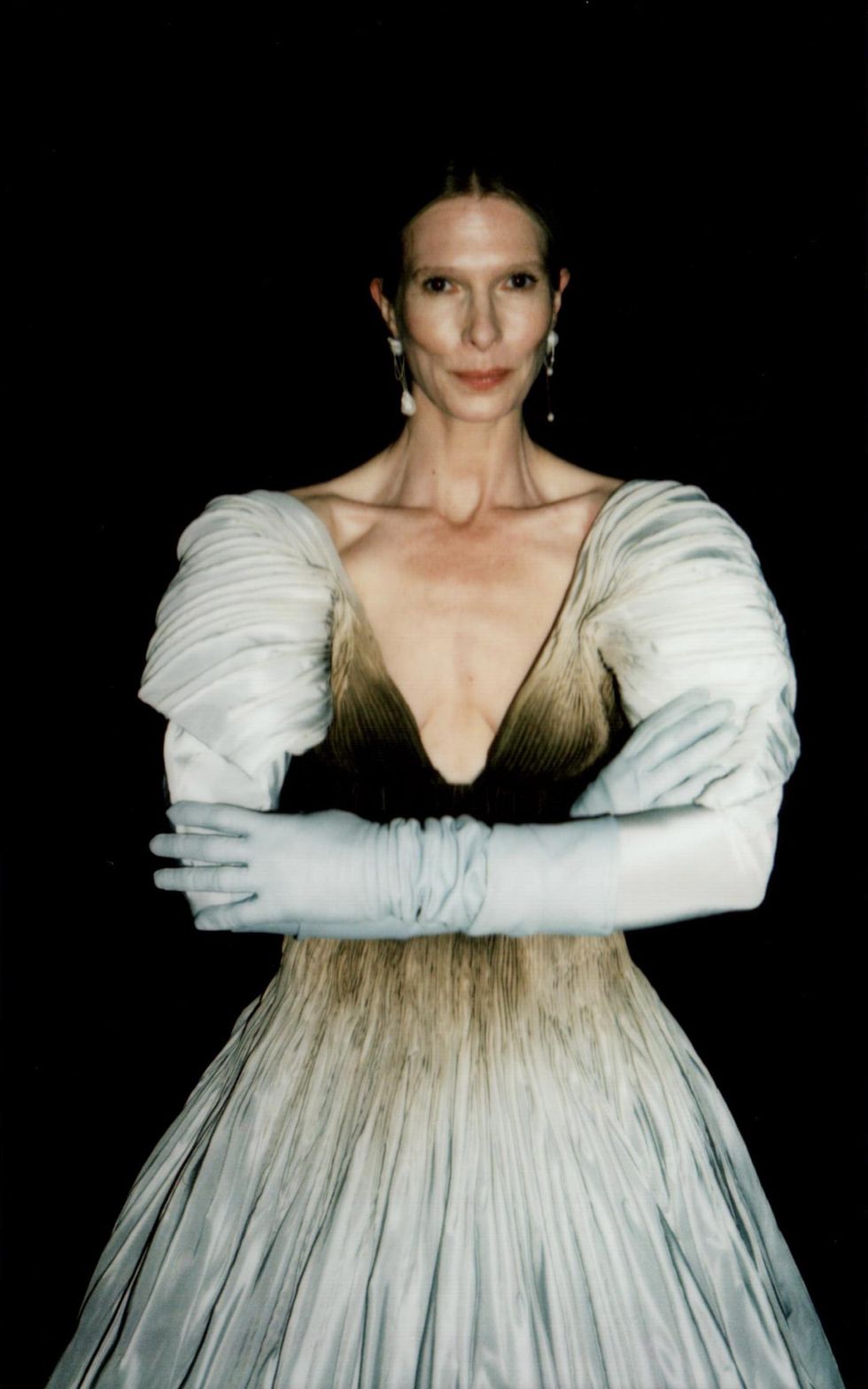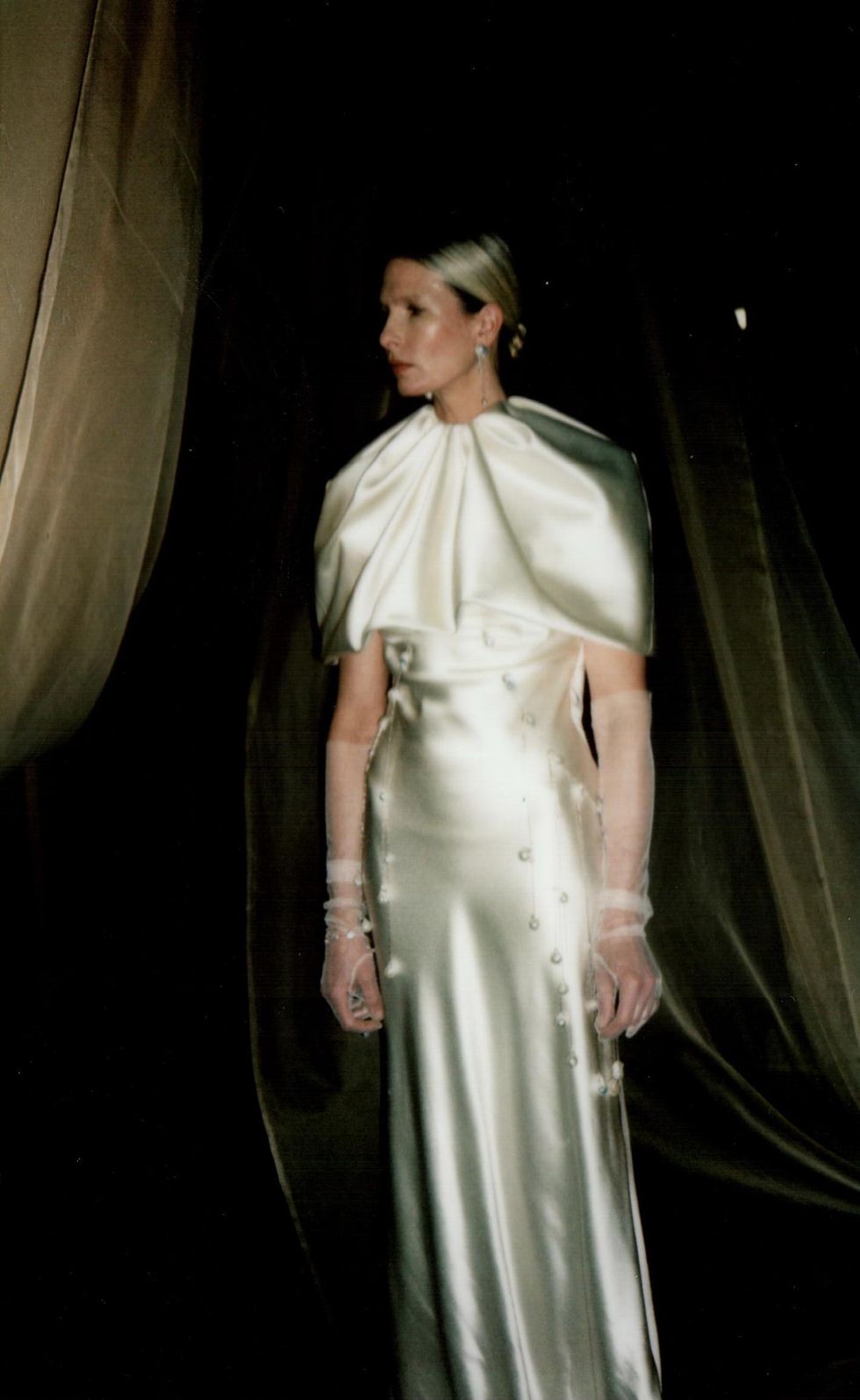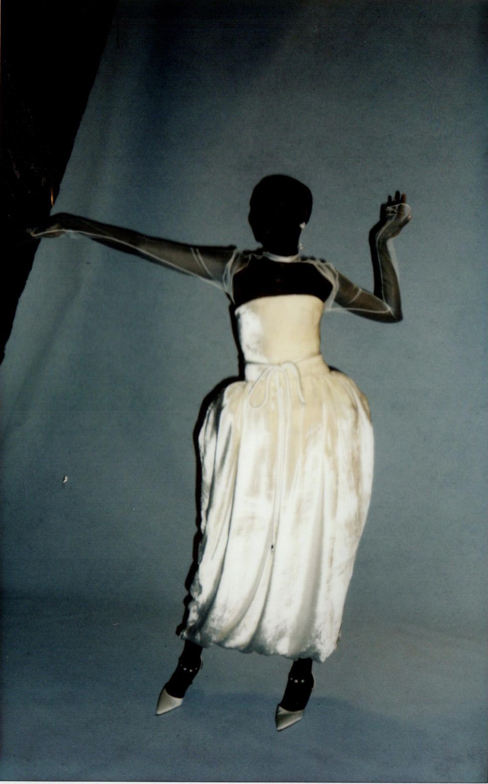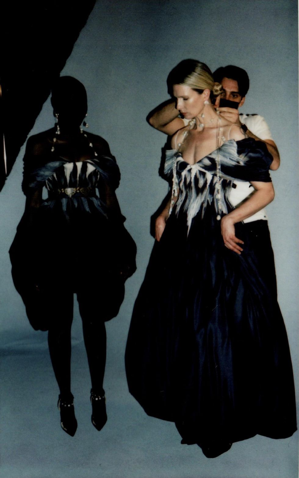 For her first collection in over a year, Hirsch is venturing into ready-to-wear for the first time. She enlisted her muses Christina Kruse and Grace Bol to show off her RTW debut, which sees her using color for the first time and includes a footwear collaboration with Manolo Blahnik. (The pearl necklaces, head pieces and anklets all belong to Hirsch.)