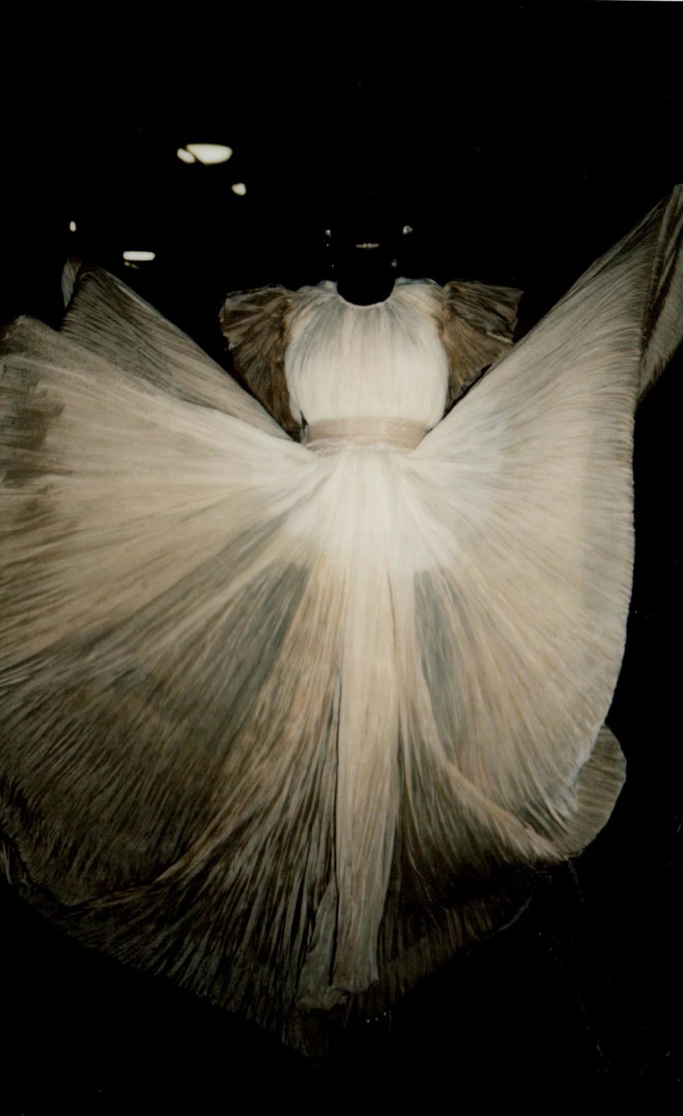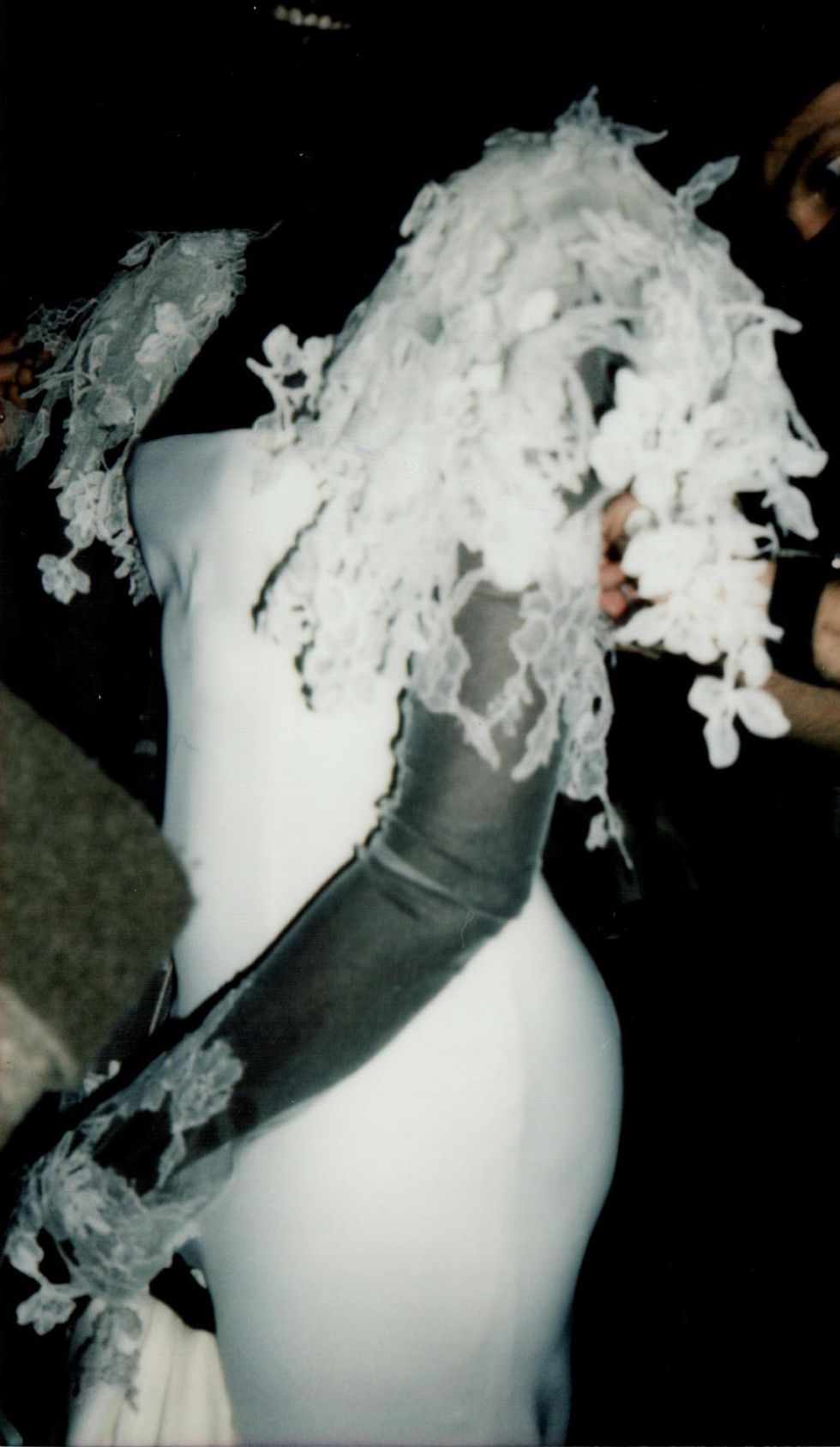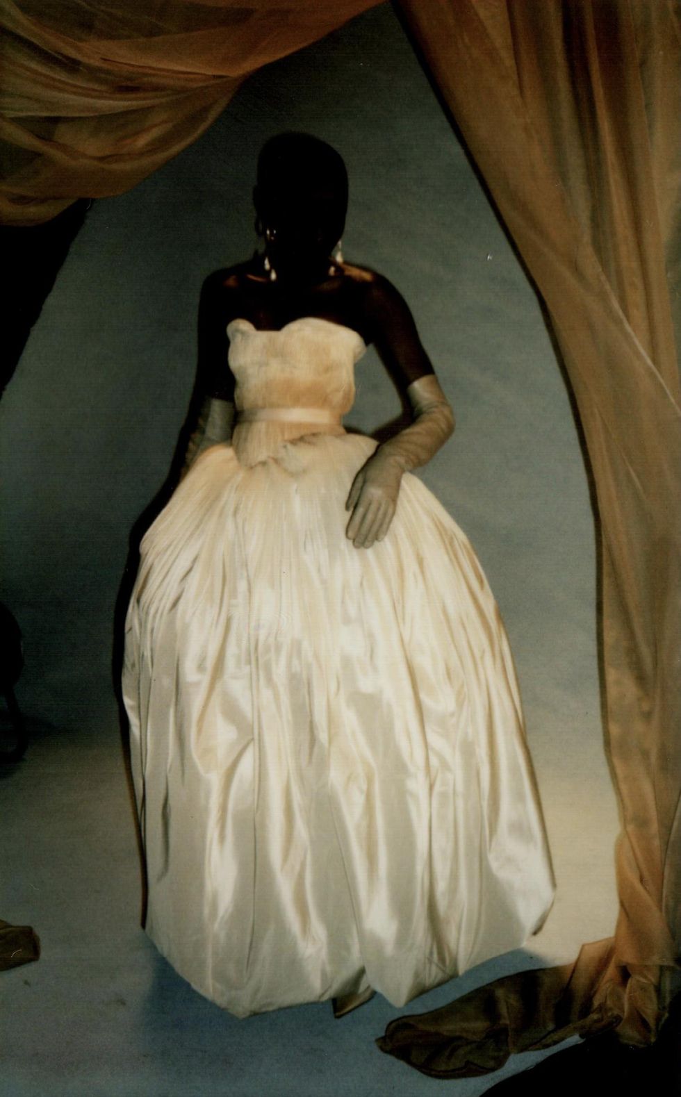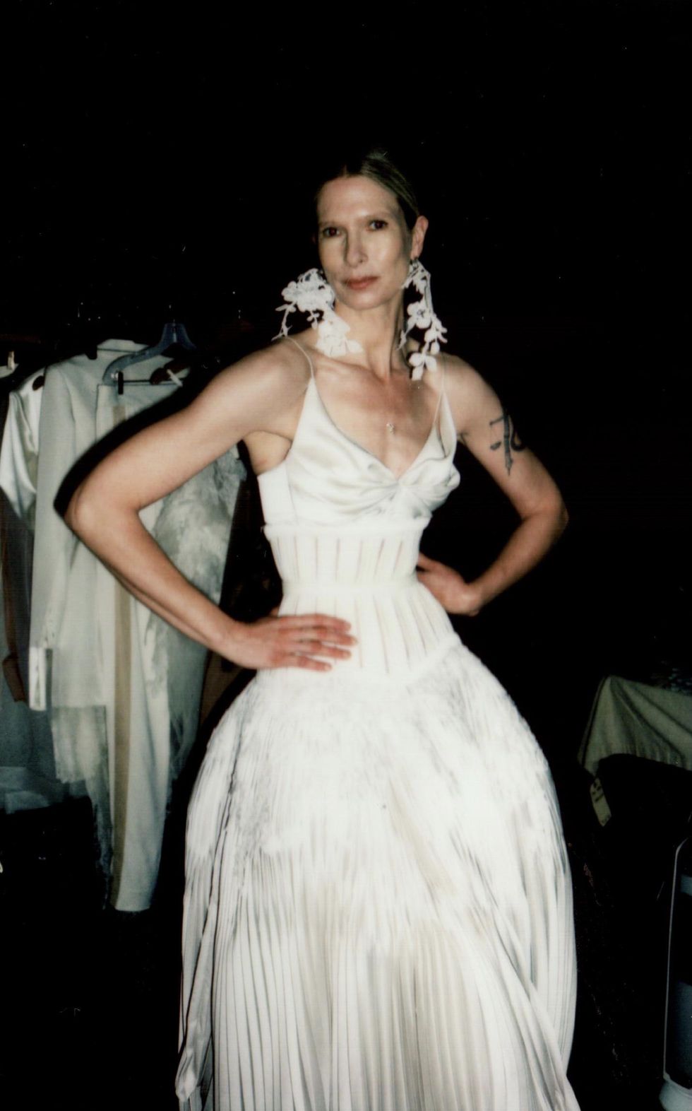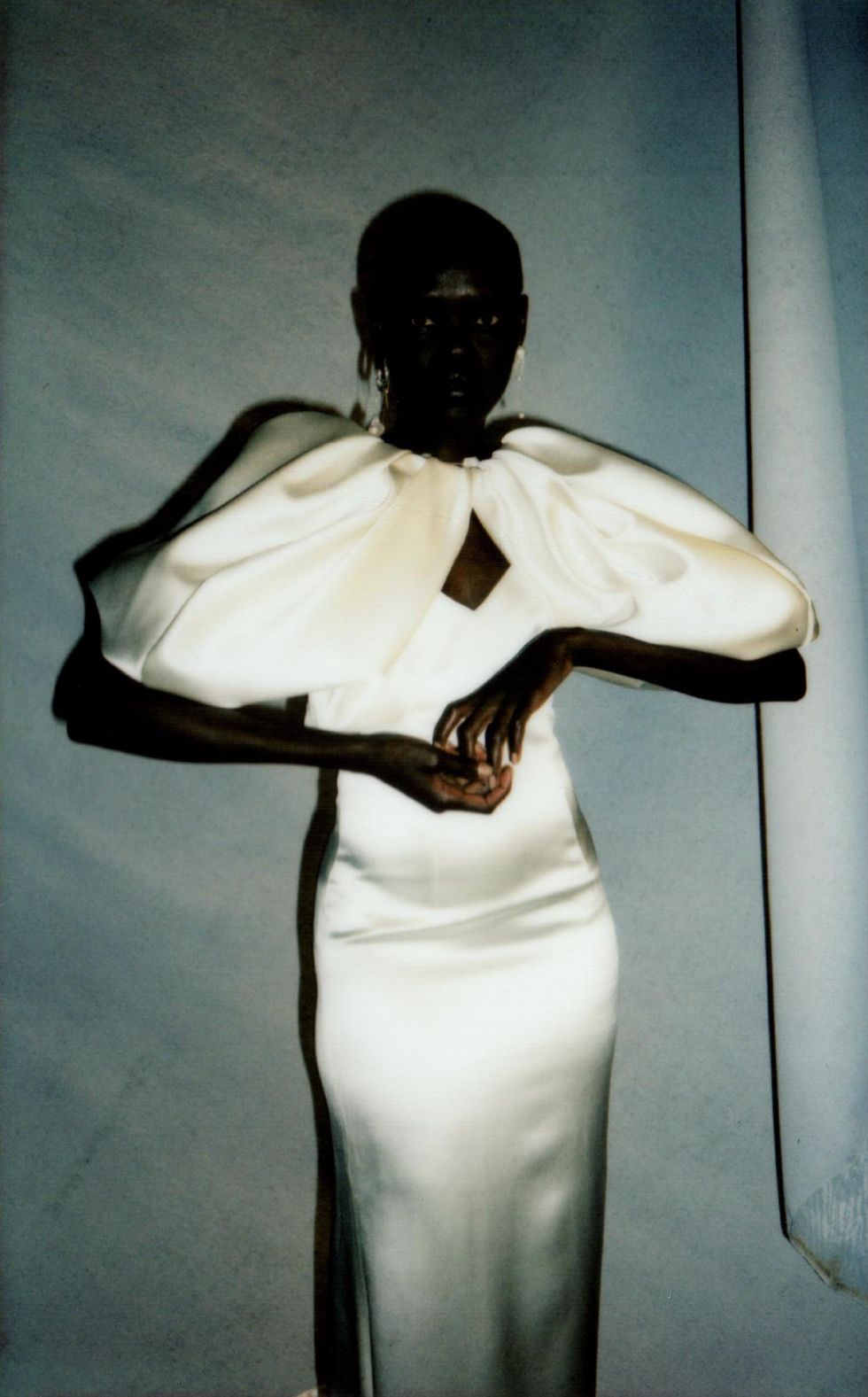 For her first collection in over a year, Hirsch is venturing into ready-to-wear for the first time. She enlisted her muses Christina Kruse and Grace Bol to show off her RTW debut, which sees her using color for the first time and includes a footwear collaboration with Manolo Blahnik. (The pearl necklaces, head pieces and anklets all belong to Hirsch.)