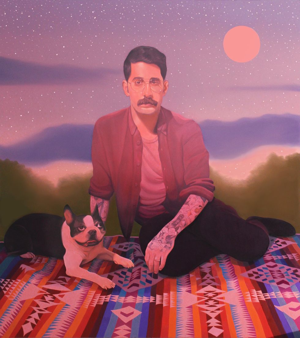 Recently, I have been gesturing to the vast canon of European royalty painting, by blending the epic and banal in painted images of gay men and their dogs. This combination quotes the pageantry of that history — their rich garb and over-the-top landscapes — and in so doing, elevates queer bodies and bodies of color from second class, to royal class.