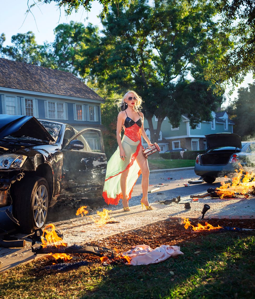 In a way, it's rather jarring seeing these videos placed in the context of today's somber news cycle, something she acknowledges as well. "It does feel somewhat strange to have these three videos in the times that we're living in," she says. Among the scenes are car crashes, raging fires, and panicked crowds of people fighting and attacking each other, all of which conjure an "end-of-the-world" reality.