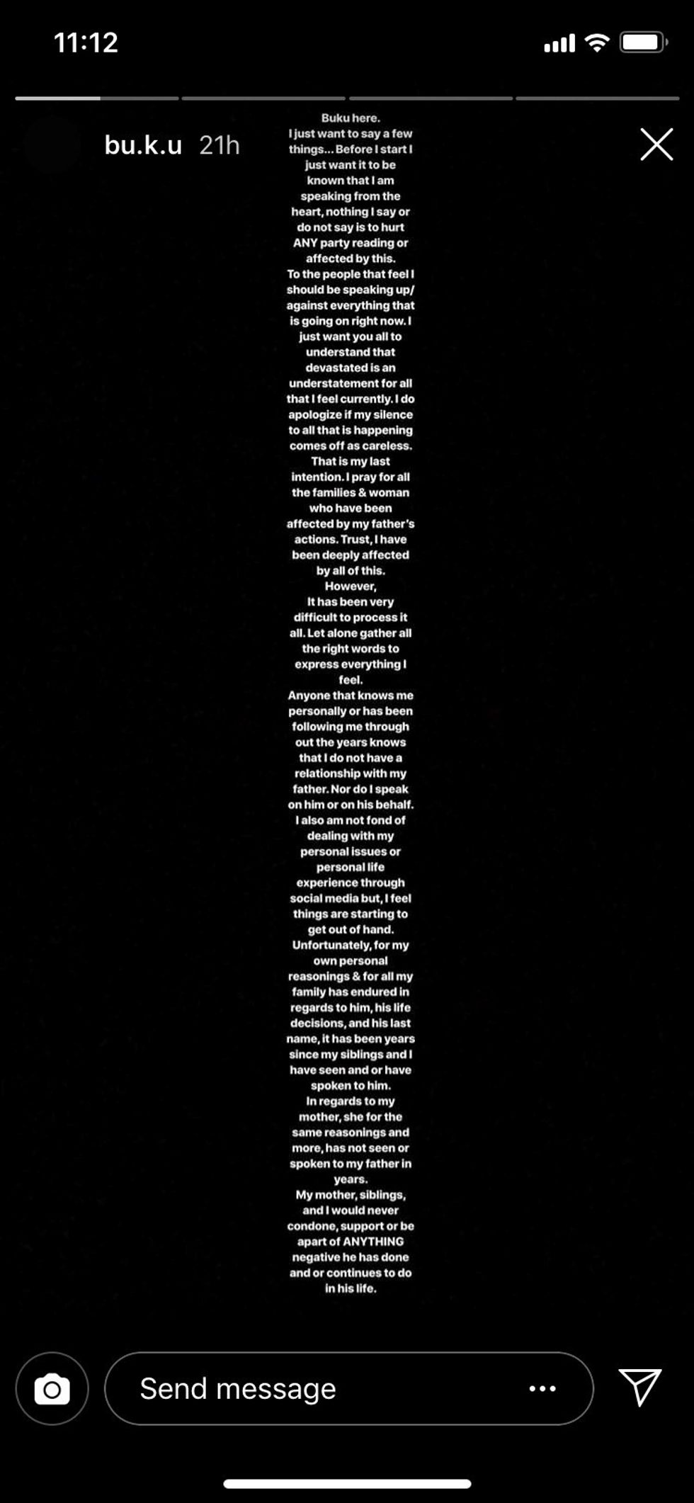 Now, after facing criticism on social media, Kelly's daughter Buku Abi is speaking out on the subject of her father and clarifying that she, her siblings, and her mother are "well aware of what he is" and "would never condone" his behavior. They've all been estranged from him for years.