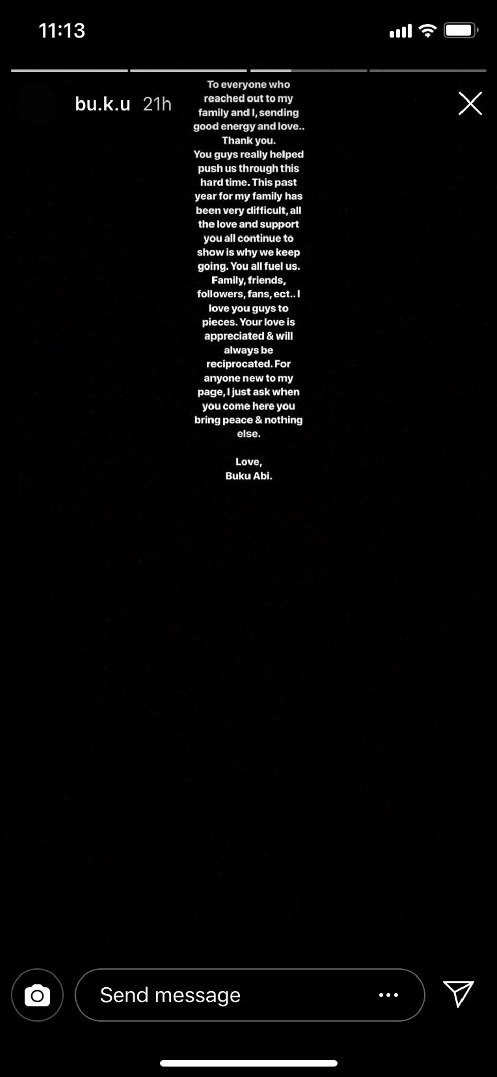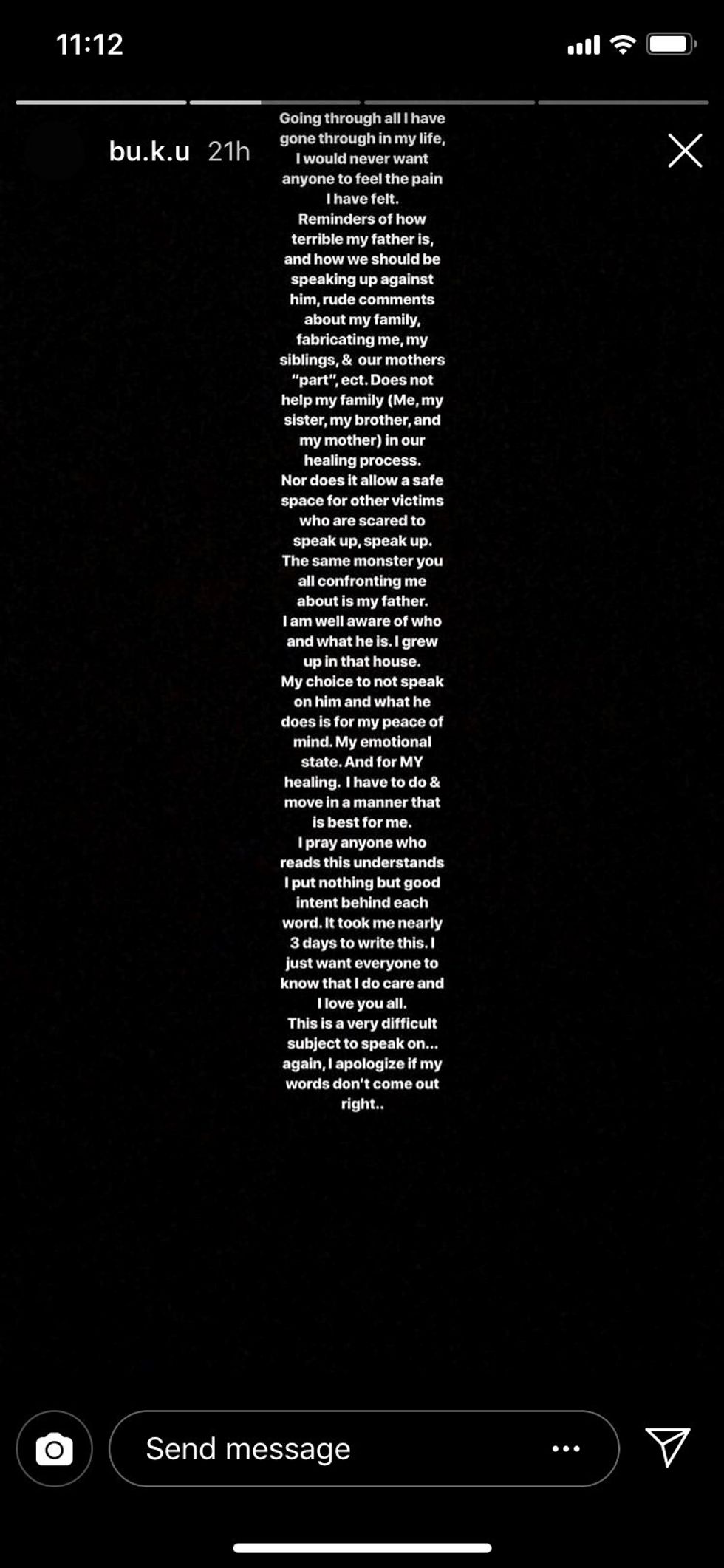 Abi adds that anyone "who knows me personally or has been following me throughout the years knows that I do not have a relationship with my father." She expresses empathy with Kelly's victims, but adds that "reminders of how terrible my father is, and how we should be speaking up against him, rude comments about my family, fabricating me, my siblings… Does not help my family [in our healing process]" nor "does it allow a safe space for other victims who are scared to speak up, speak up."