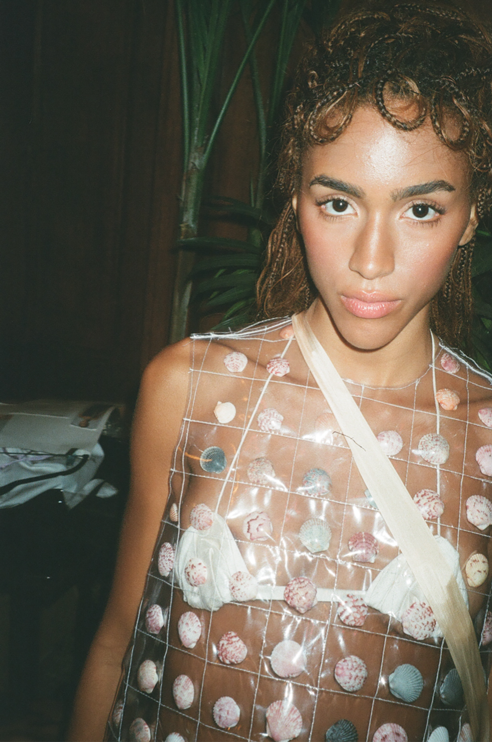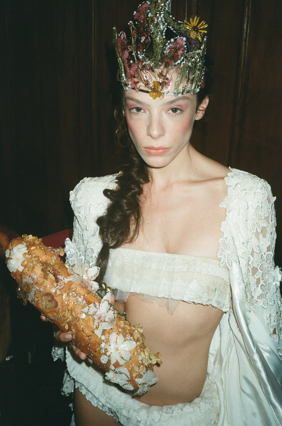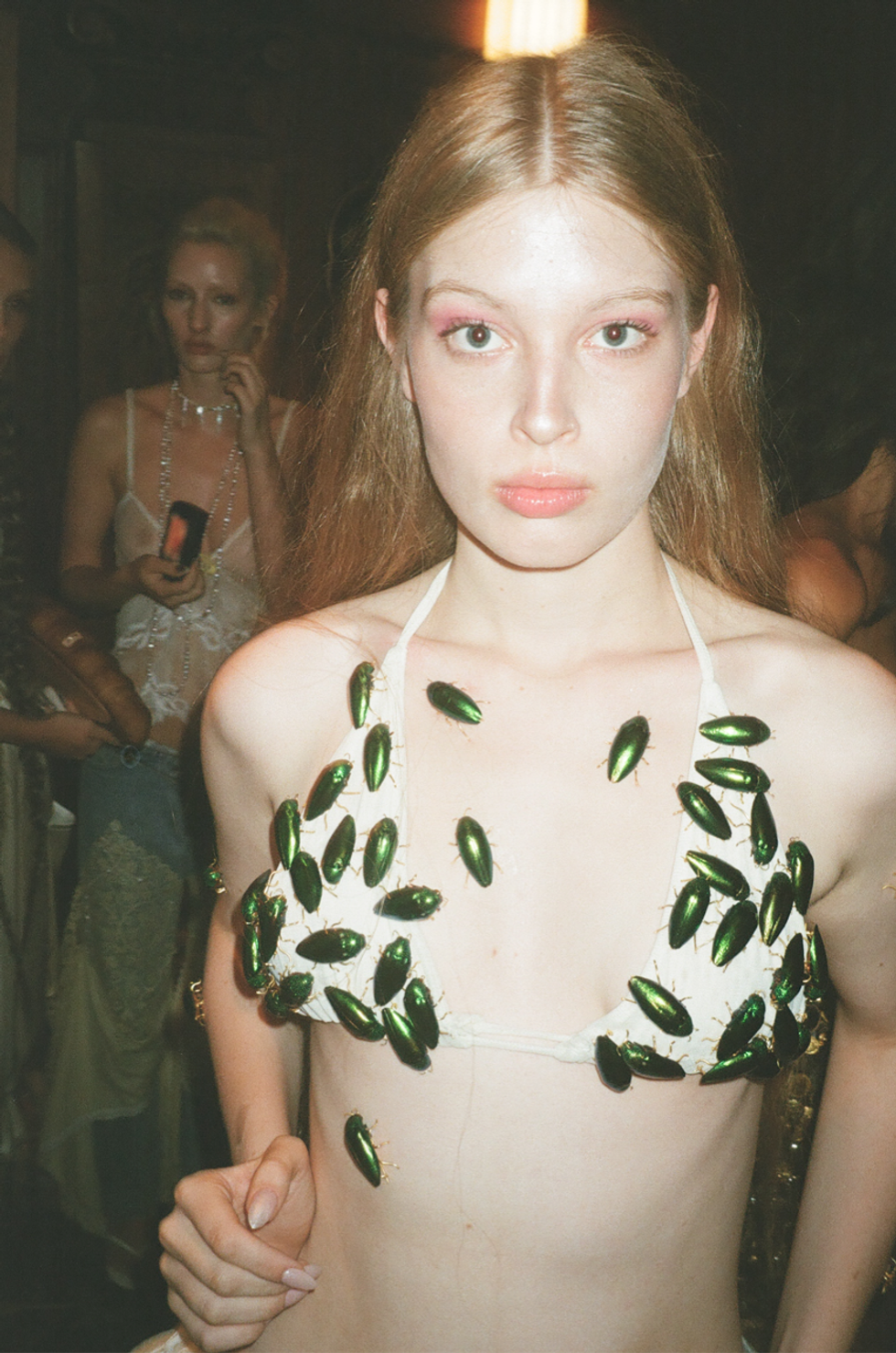 Before the show’s final two looks closed out the runway — a bulbous bridal look and a set fit for a sea-queen — a resounding scream broke through the silence of the audience, and Vivian Jenna Wilson burst through green velvet curtains. The battle cry of a girl at war with herself, perhaps. (I’ve stifled screams just as shrill in my own moments of self-doubt and frustration.) This scream was supplemented by an ethereal soundtrack produced and composed by Jake LeCarner, AKA The Analysts, which blended shrill cries with the ambient sounds of sirens and nature. Wilson commanded the runway in a bra top and asymmetrical bubble skirt covered in Cheng’s beetles. As she navigates her own tumultuous journey of self-discovery and boldly advocates for transgender rights, she was the perfect girl for the job.