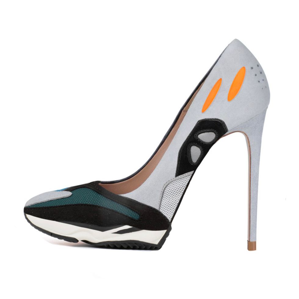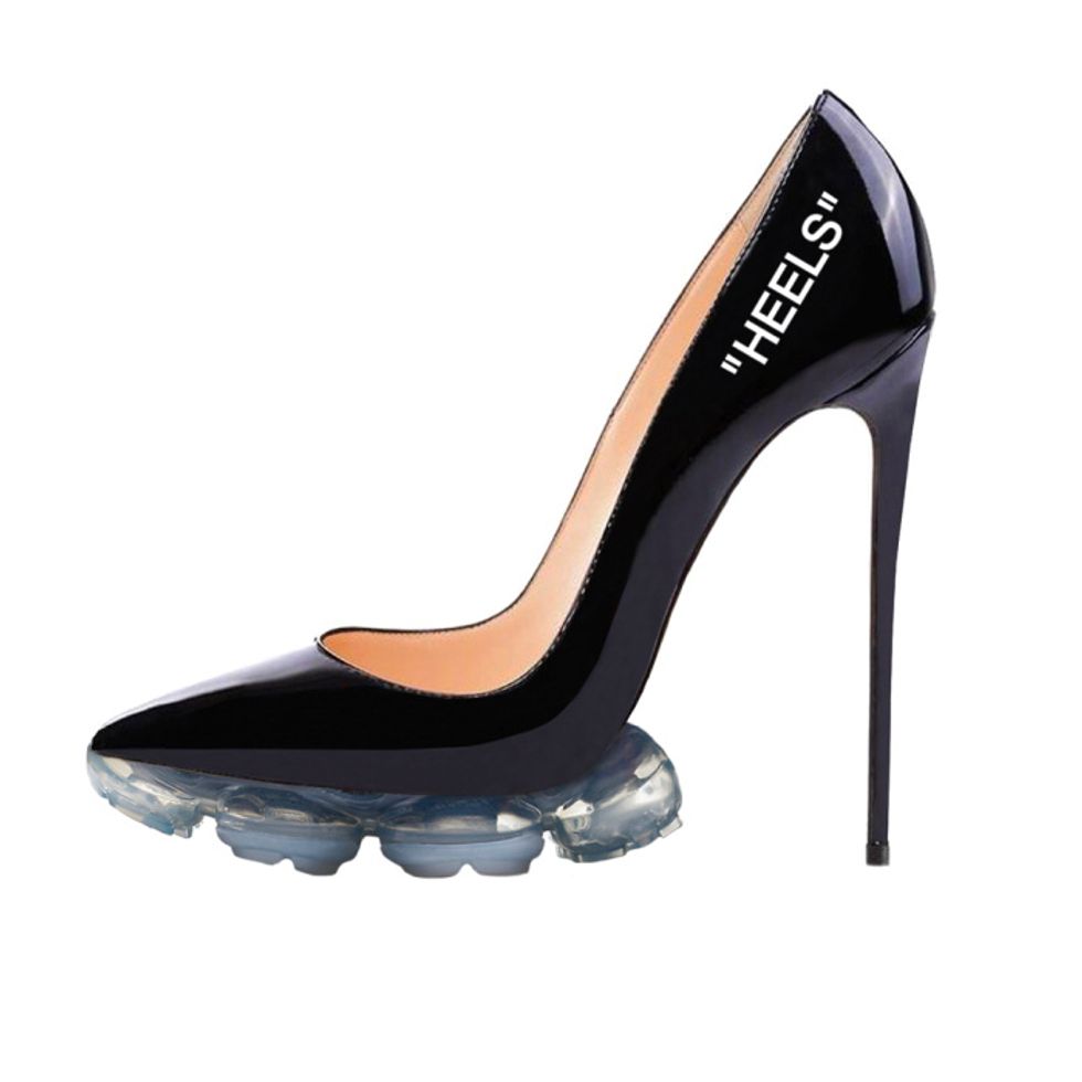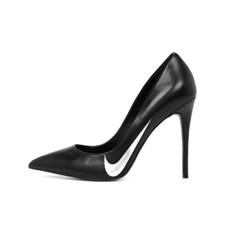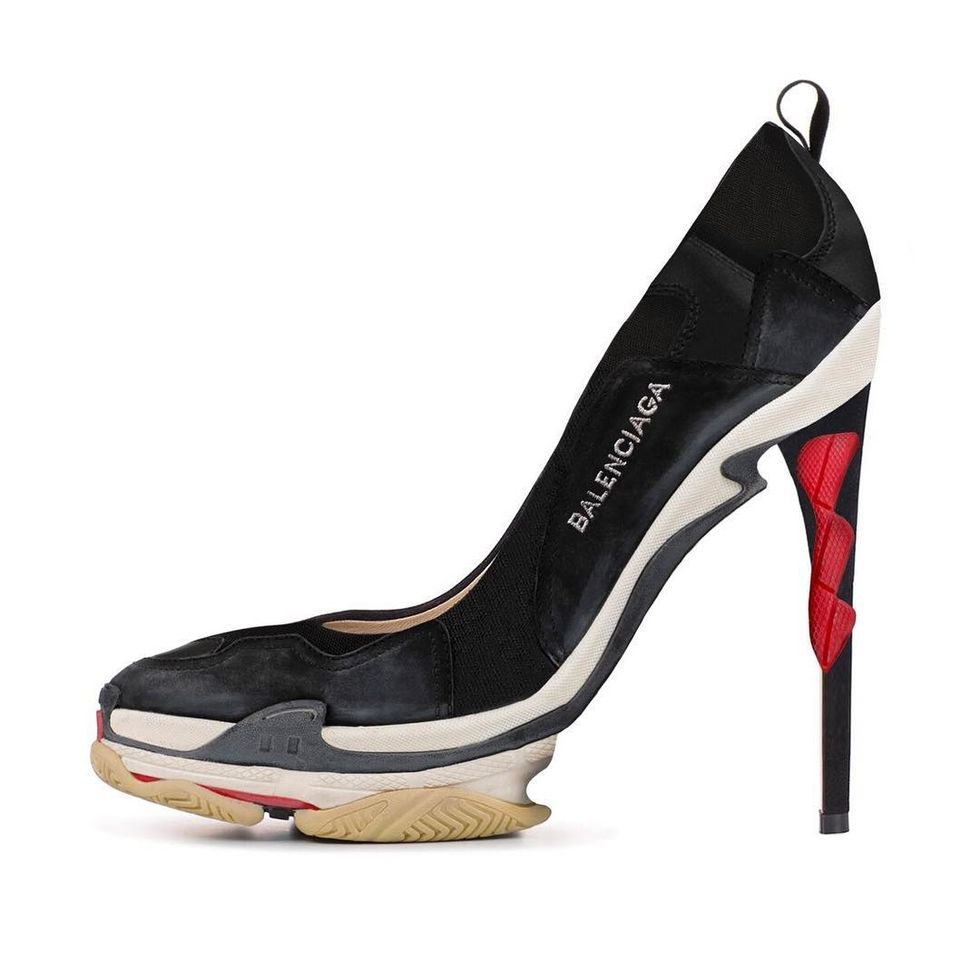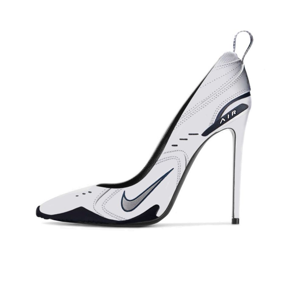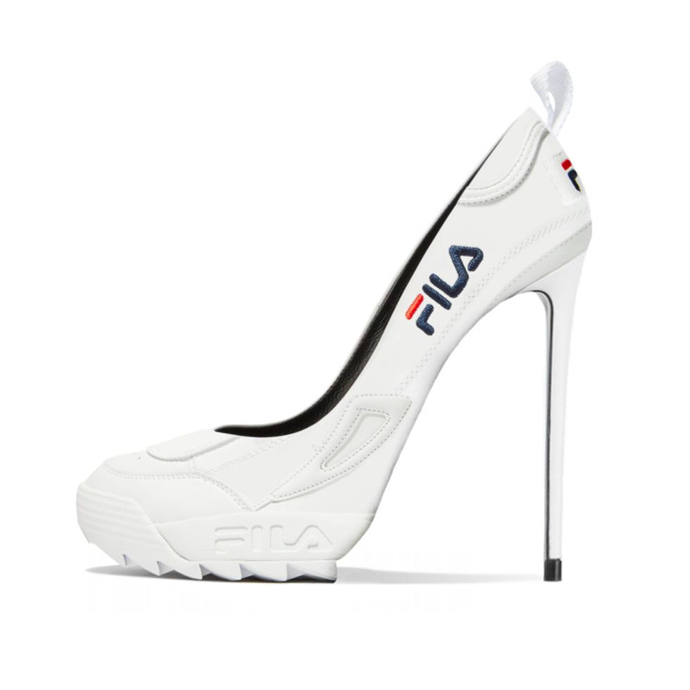 Sometimes, you need to throw on a comfy pair of kicks to run down to the bodega and grab a bacon, egg and cheese before working in your apartment all day. Other times, you need to dress to the nines in 6-inch heels that make you feel taller than God herself. And then there are those other times — which happen more often than we are maybe even aware of —t hat we need the perfect combination of the two in order to show off our hype-y athleisure aesthetic with a wink and a nod to our high femme, boardroom killer instincts. Enter graphic designer and art director Davide Perella, who concocted just such a line of footwear below, bringing together iconic sneakers from Fila, Yeezy, Nike, Off-White and Balenciaga with a pointed toe and a stiletto heel. The shoes are "for people who don't care about comfortable sneakers," Perella said, adding simply, "In a world of dad sneakers, just be yourself."