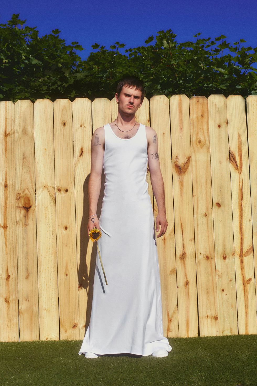 Realistically, I consider people like Bad Bunny or Post Malone — figures who are like-minded and already pushing the mission. But what a dream it would be for some random white 60-year-old politician or even some finance bro fuckboy [in] his silly little suit to wear a dearDama floor-length frilly chiffon gown walking down the street, hand-in-hand with his girlfriend wearing jeans and a blazer. The day that’s an average occurrence and no one bats an eye is the day toxic masculinity has officially lost.