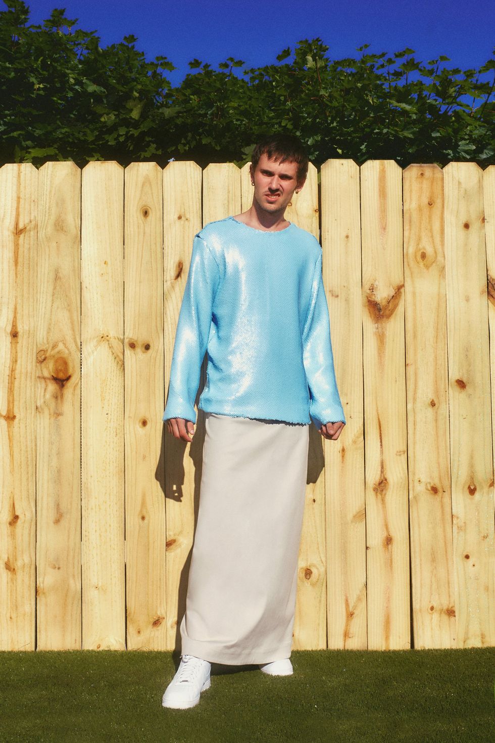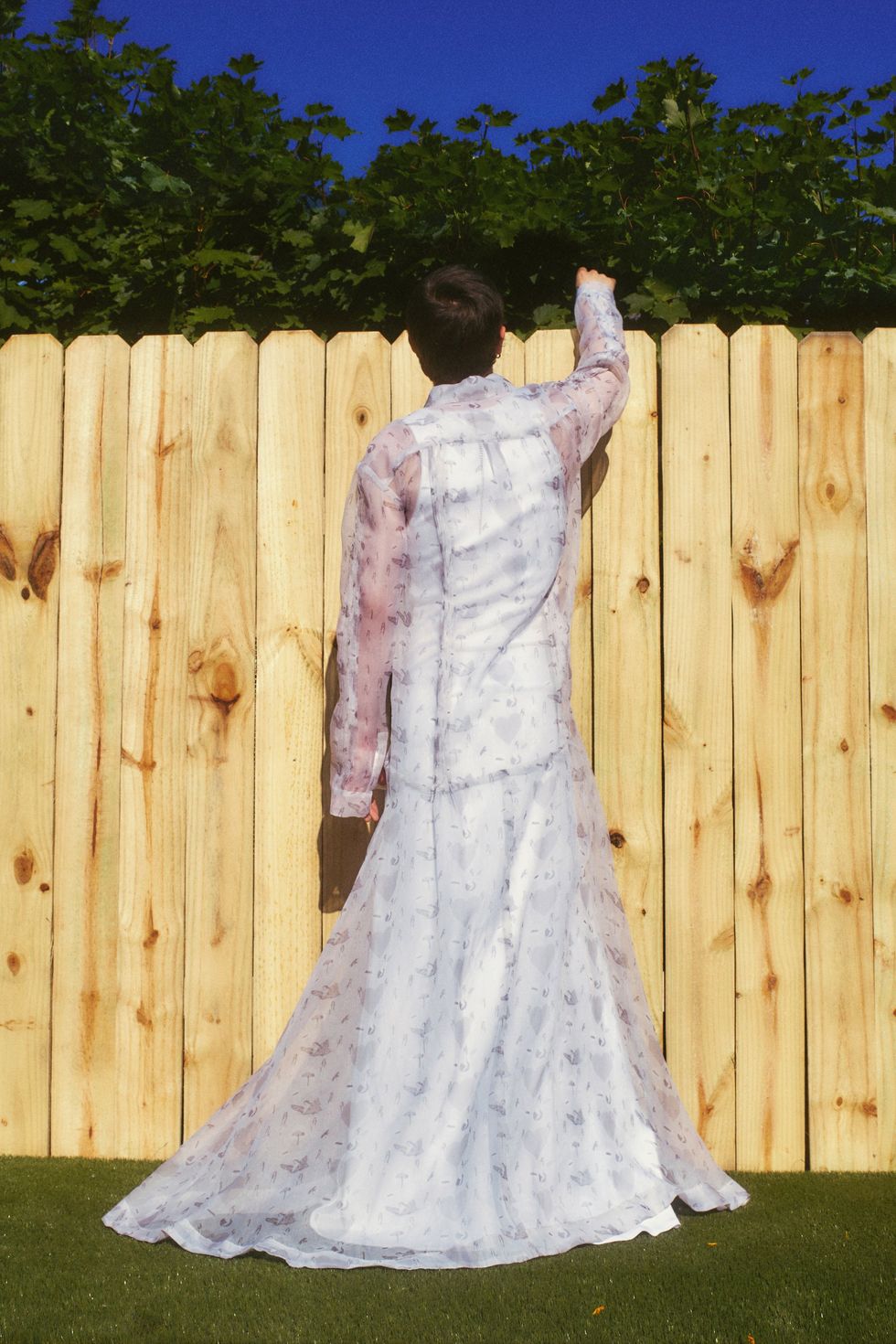 The materials are of equal importance to the process as they play an equal part to the gender expression. When it comes to clothes, many silhouettes and materials alike are intrinsically tied to predated gender constructs. If I said to imagine a flowing piece of chiffon on a body, most people would imagine that body as female, because that’s mostly what they have been exposed to thus far. Those are the standards we aim to fade [by] making garments like a tailored jacket out of chiffon instead.