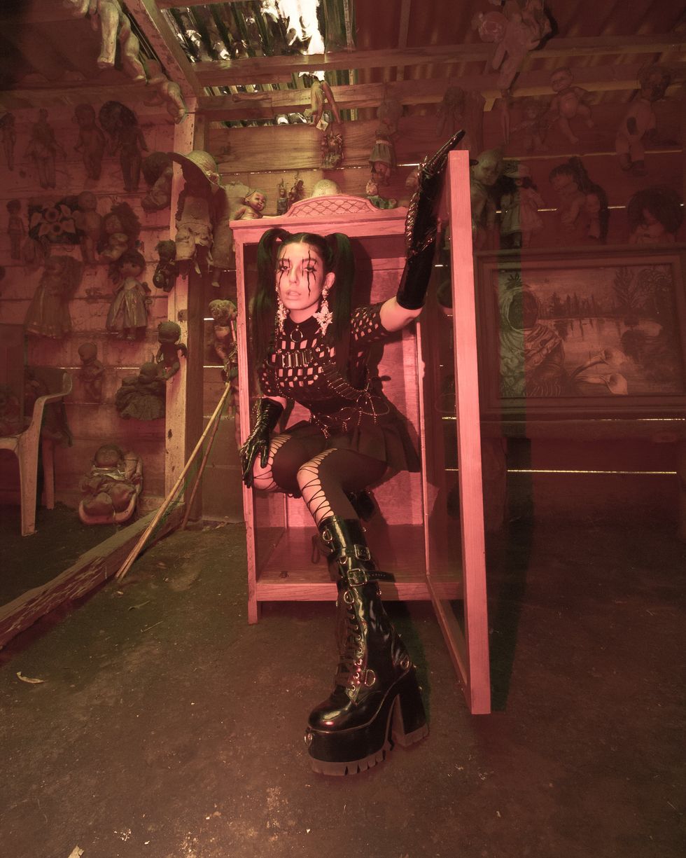 In monstrous times, Romy is one of many young artists — alongside peers like Ashnikko and Billie Eilish (they're mutuals) — who've found power and security in styling themselves as a monsters. Romy first attracted a following on Instagram and Tumblr with her hip-hop-infused pop and goth-BDSM-streetwear looks. Her signature look includes Alice Cooper-inspired make-up, which makes her look like she's bleeding from the eyes. Her videos, lyrics and and photo shoots are full of similarly spooky themes.